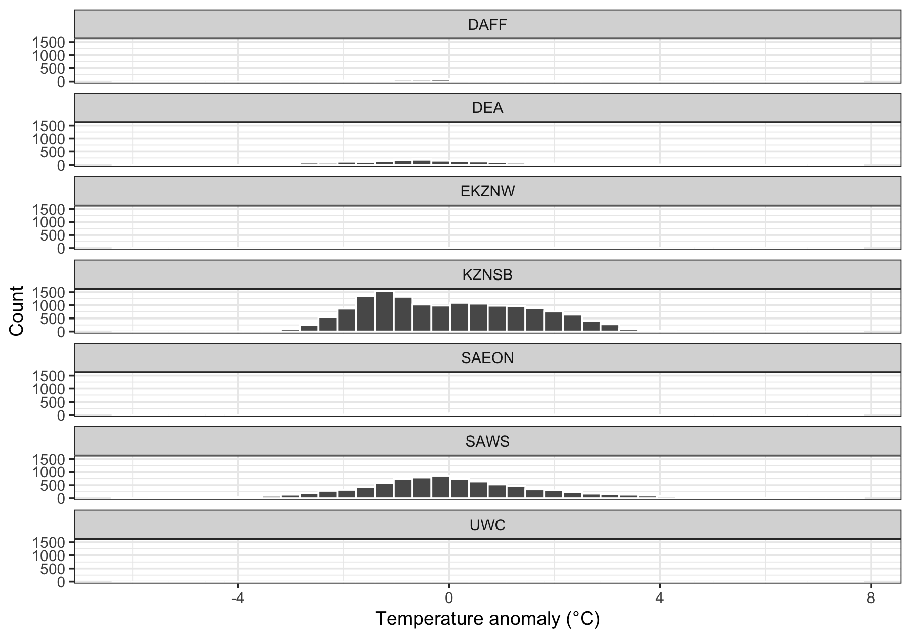 Using SACTN, compute a temperature anomaly per site as. Then create a histogram of anomalies and facet by src. (/15)