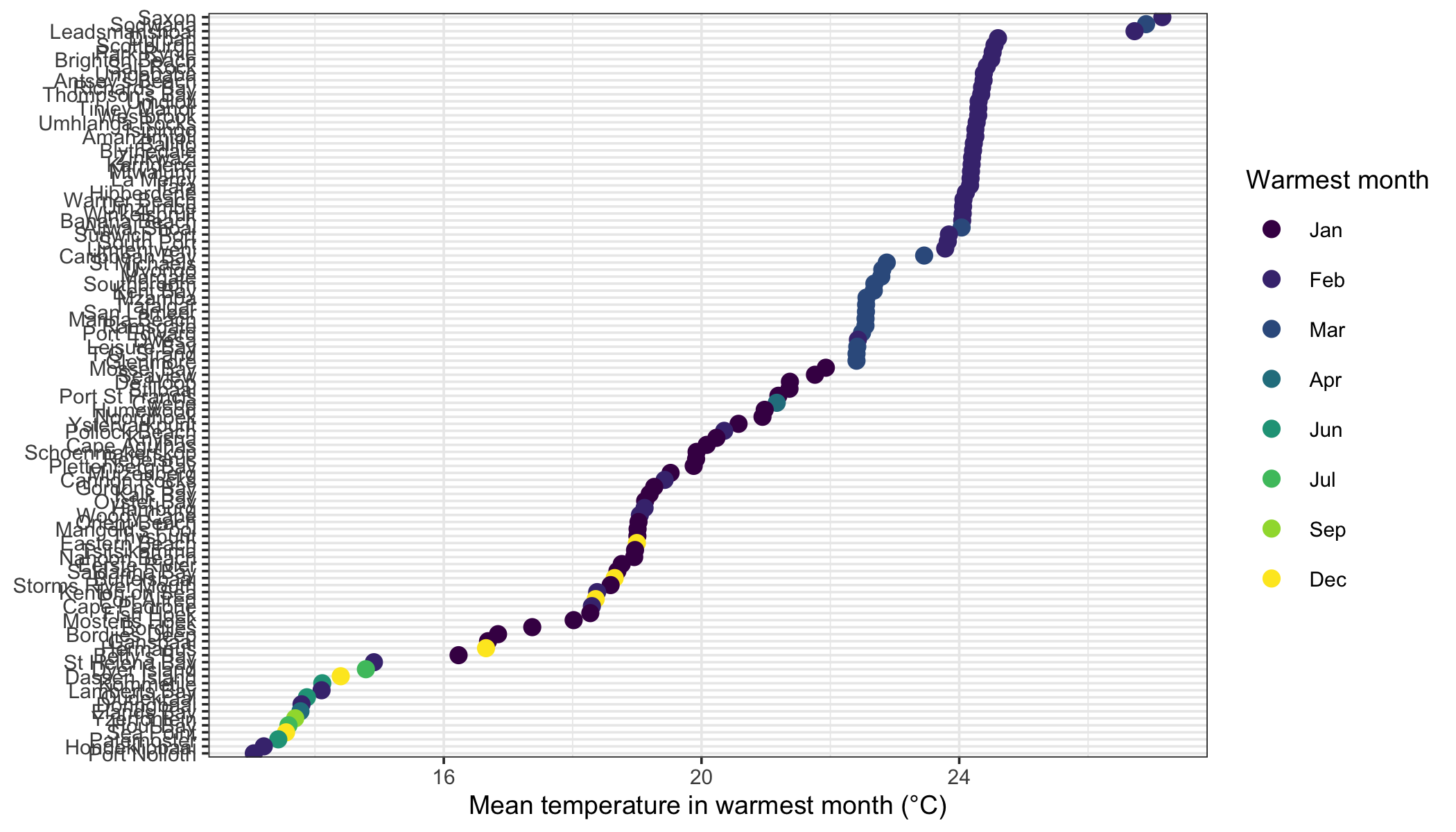 Then visualise the result as a dot plot of mean_temp by site, coloured by warmest_month. (/20)