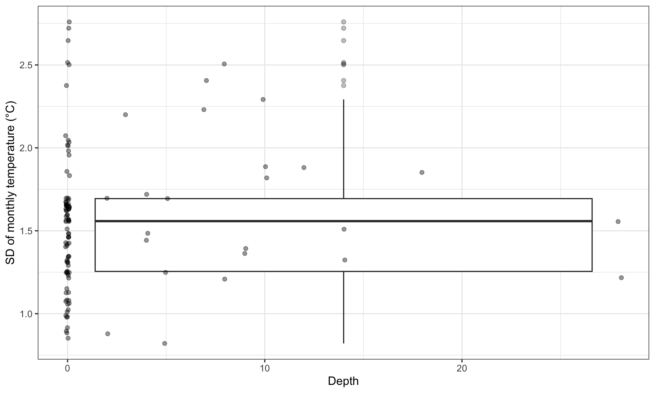 labs(x = "Depth", y = "SD of monthly temperature (°C)")The deeper temperatures tend to show a smaller spread (lower SD) than shallow temperatures, consistent with stronger thermal buffering at depth. There is, however, clear site-to-site variability in SD at each depth, suggesting that local oceanography and exposure also influence stability through time. Using IQR instead of SD would be a robust alternative if outliers are a concern.