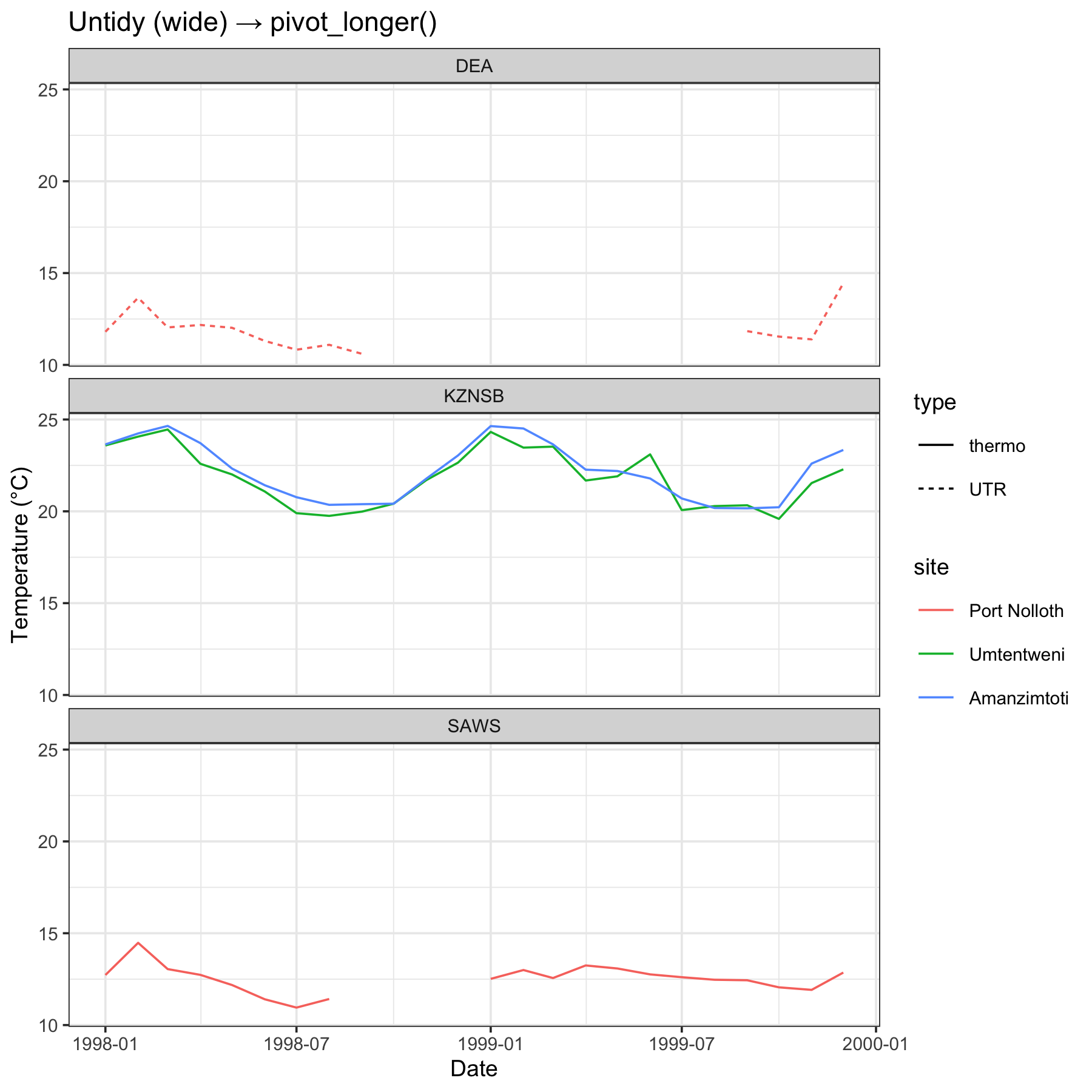 labs(title = "Untidy (wide) → pivot_longer()", x = "Date", y = "Temperature (°C)")
