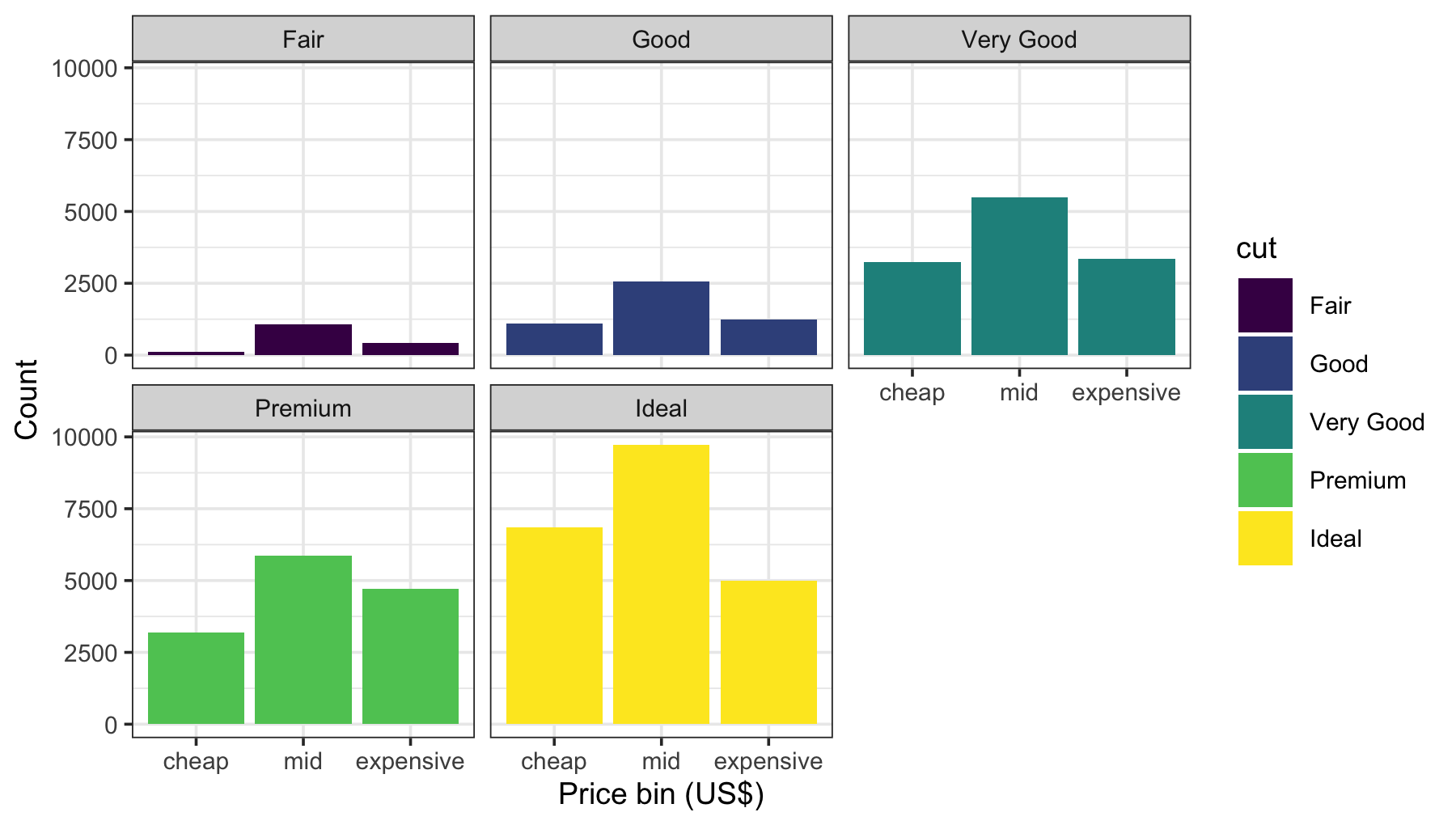 Then make a faceted bar plot (faceted by cut) showing counts of diamonds by price_bin, filled by cut. (/10)