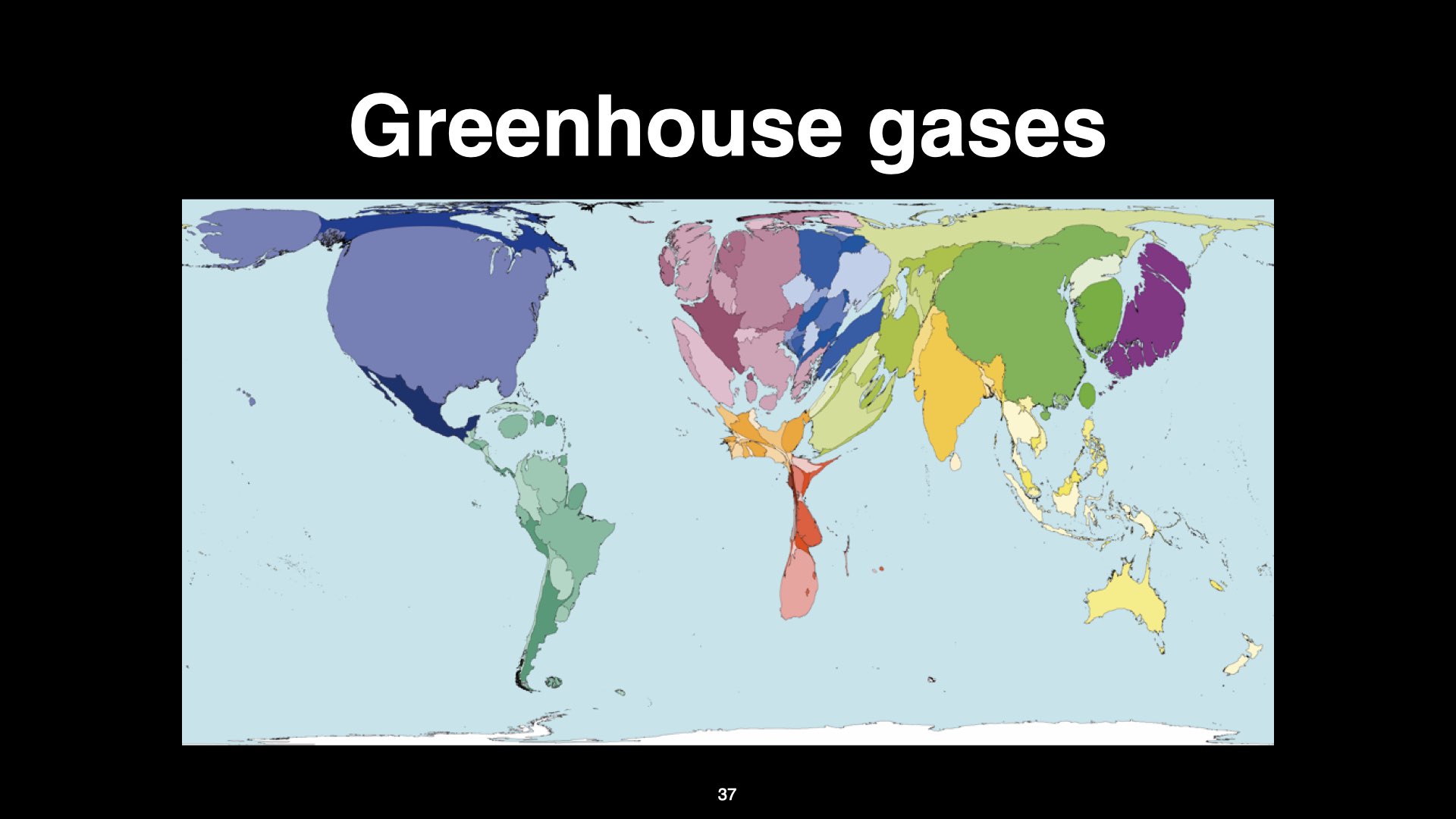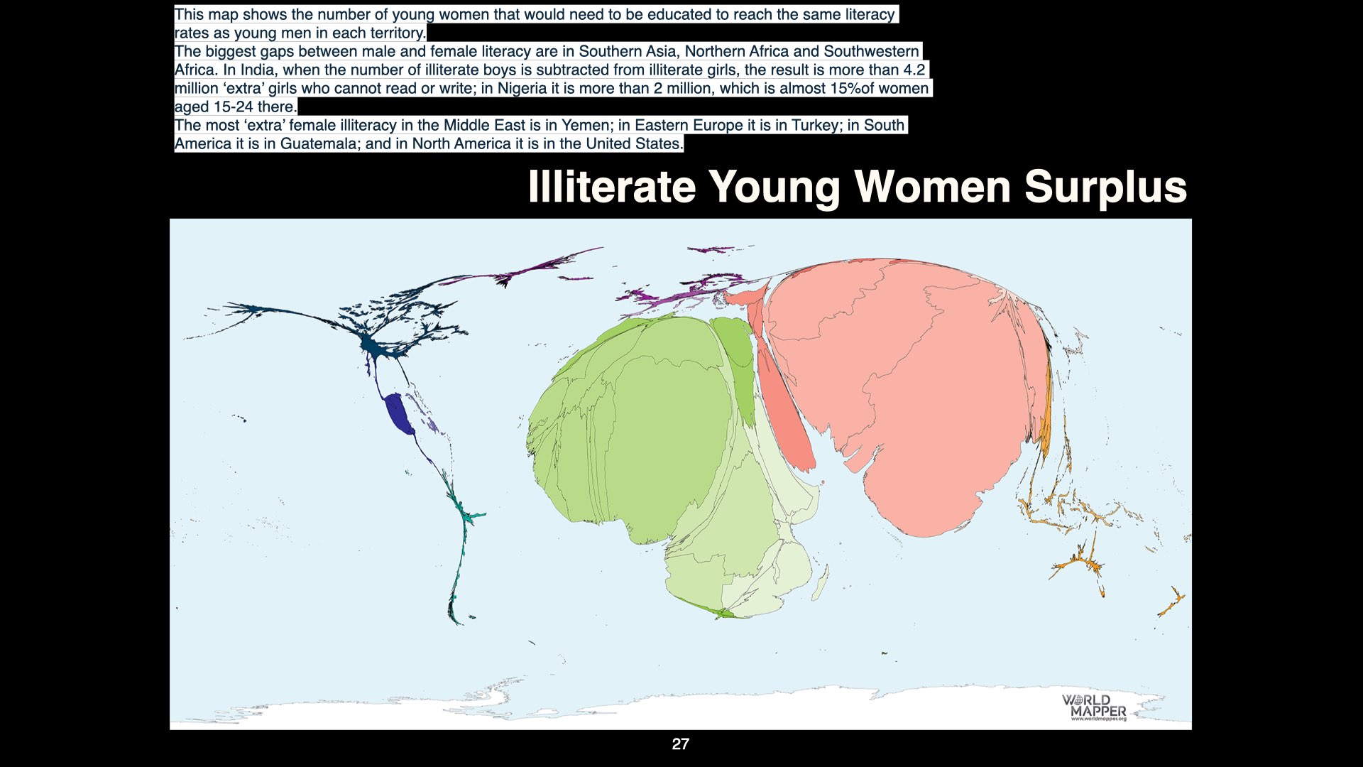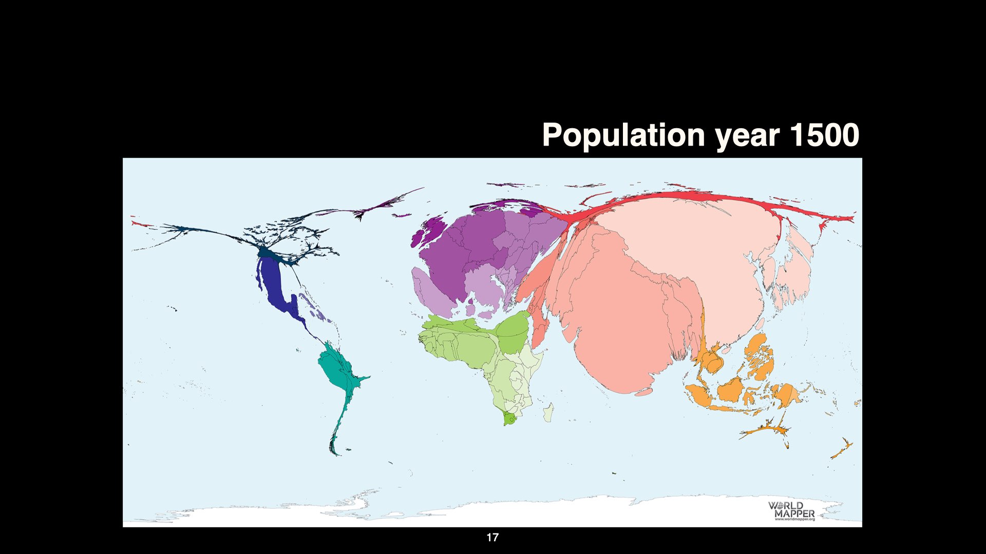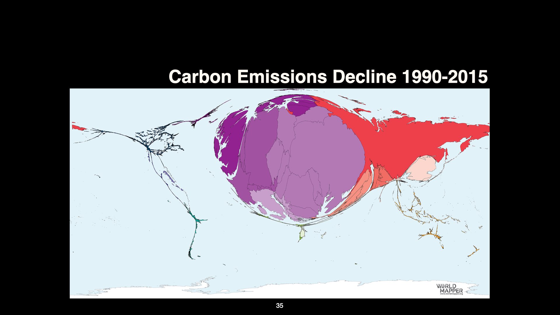 I want to show you some figures from a website called Worldmapper, which creates interesting images of world maps distorted according to the density of certain processes — for example, population density, education levels, or carbon emissions per capita.