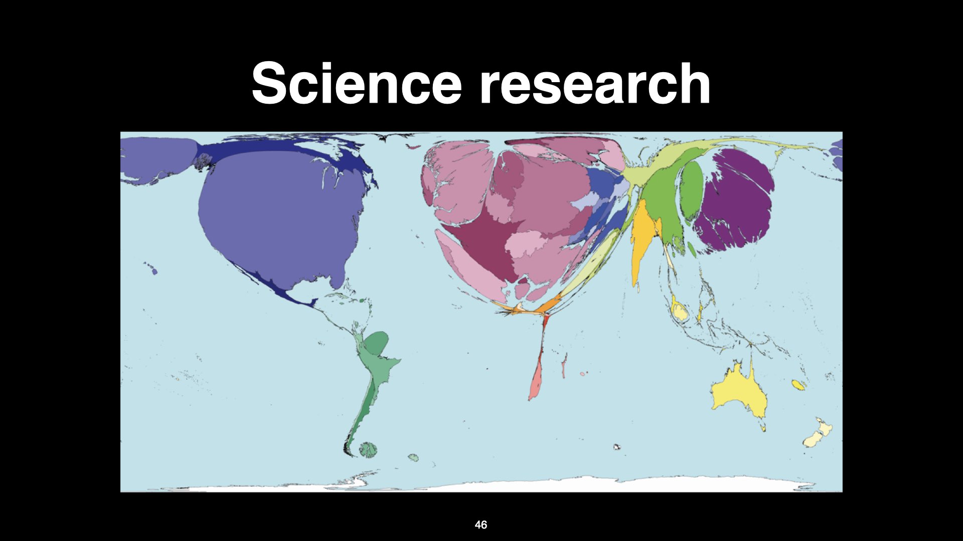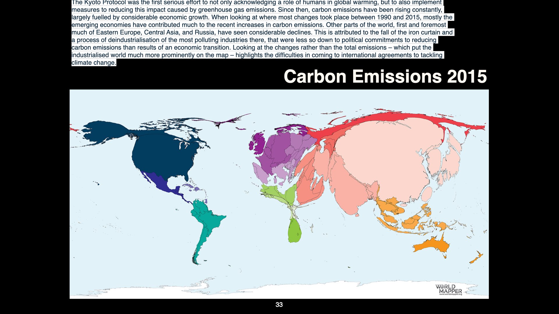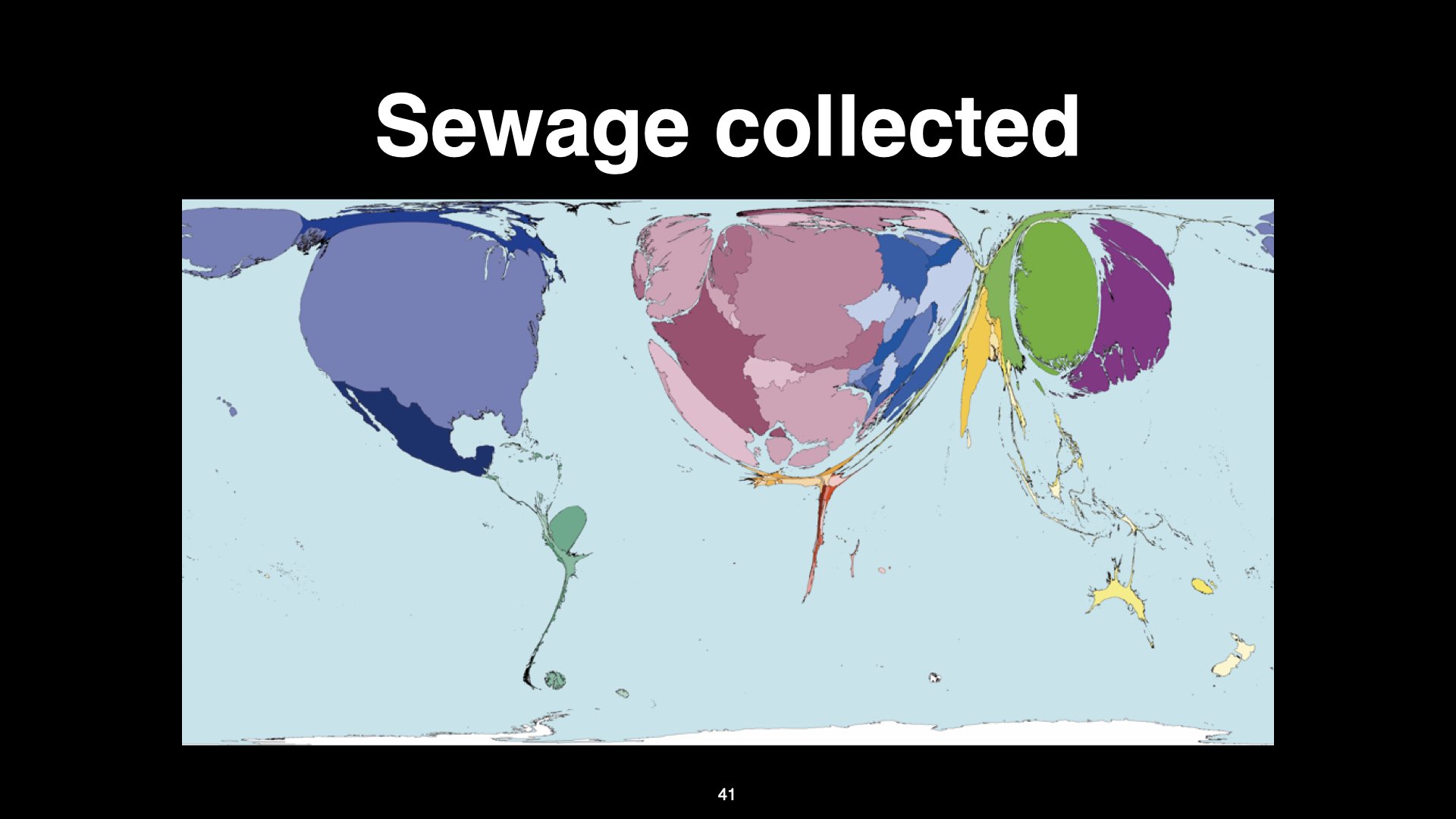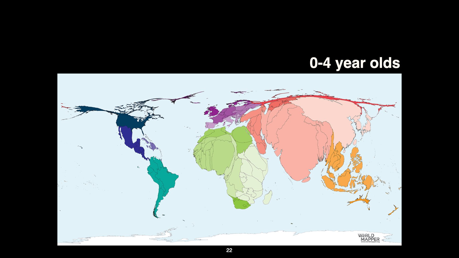 I want to show you some figures from a website called Worldmapper, which creates interesting images of world maps distorted according to the density of certain processes — for example, population density, education levels, or carbon emissions per capita.