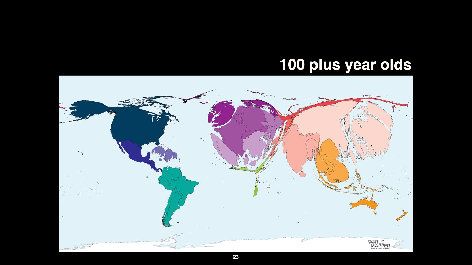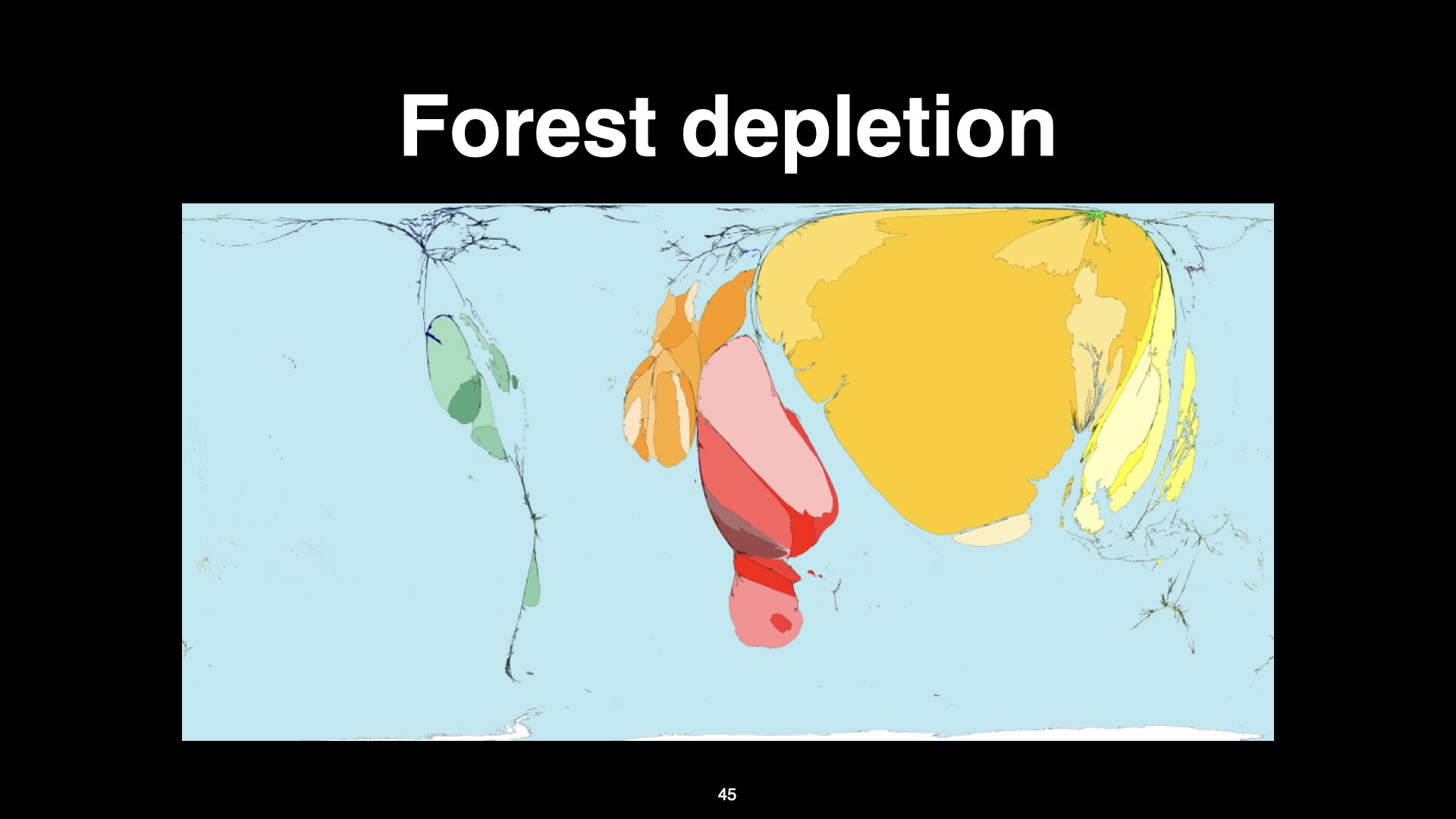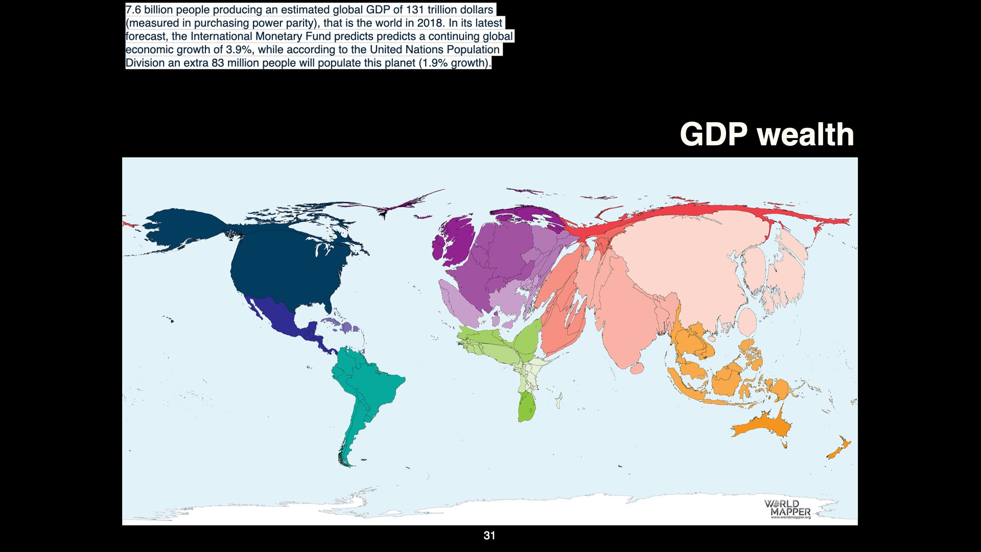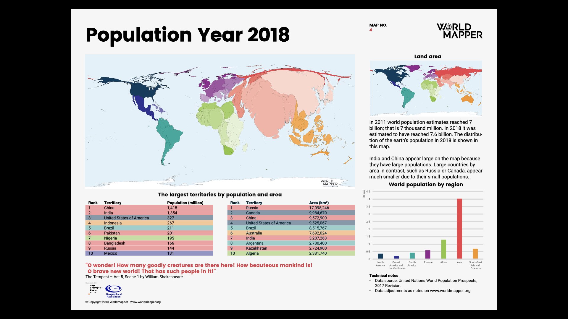 I want to show you some figures from a website called Worldmapper, which creates interesting images of world maps distorted according to the density of certain processes — for example, population density, education levels, or carbon emissions per capita.