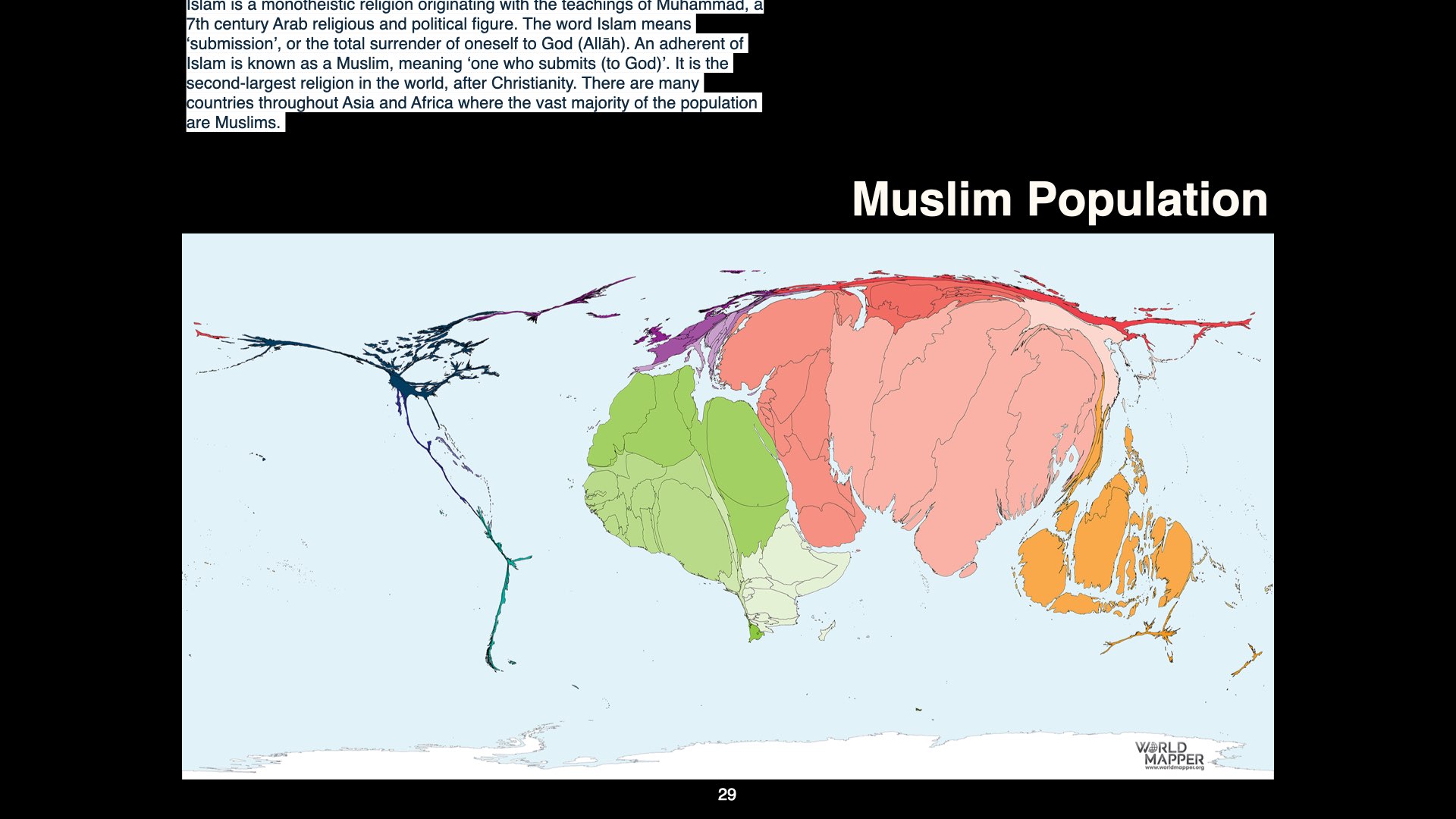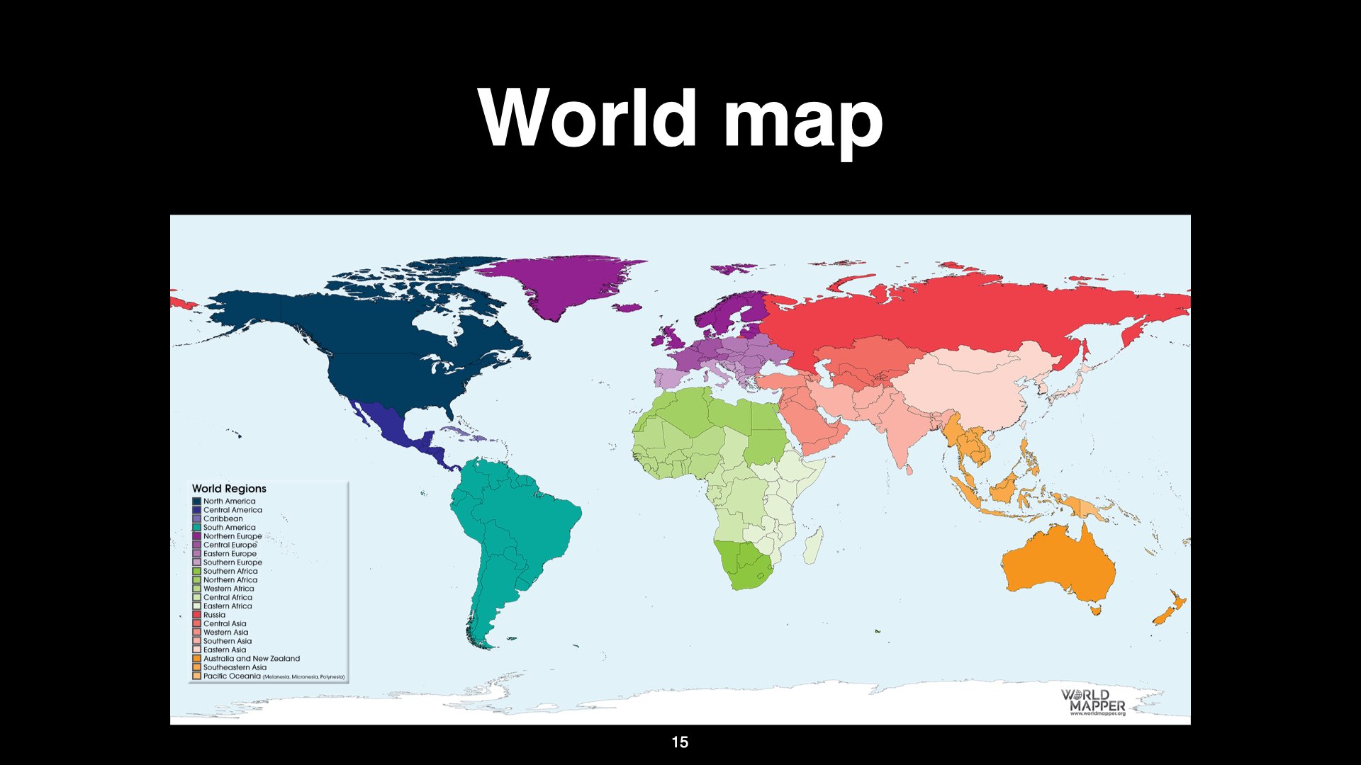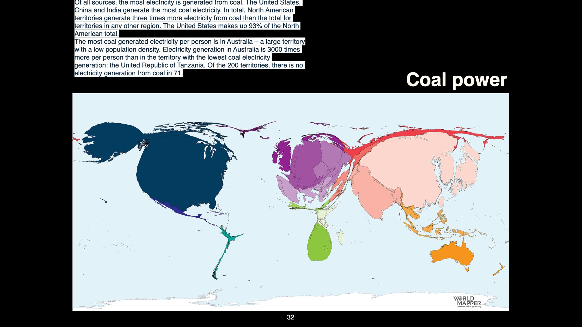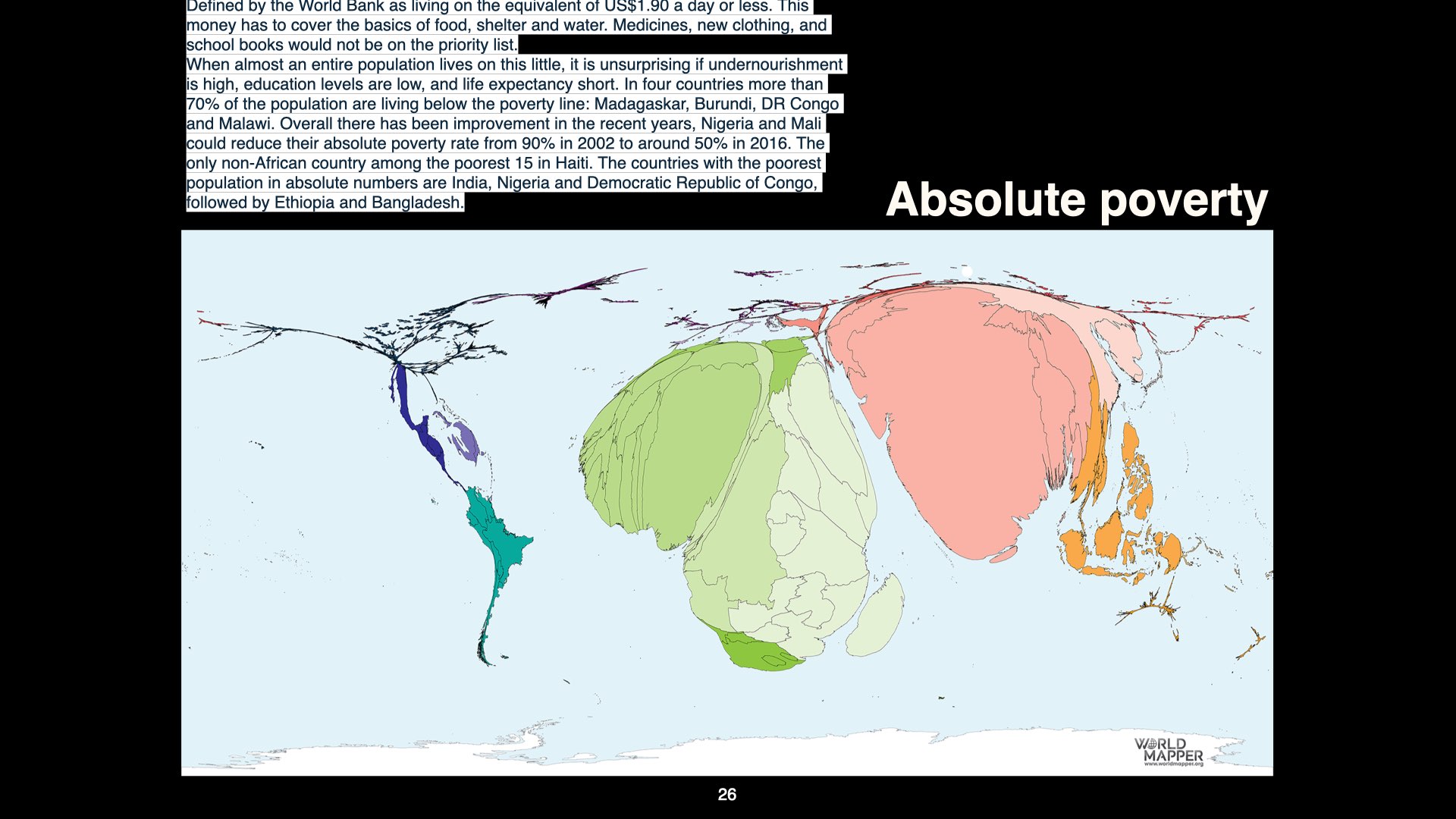 I want to show you some figures from a website called Worldmapper, which creates interesting images of world maps distorted according to the density of certain processes — for example, population density, education levels, or carbon emissions per capita.