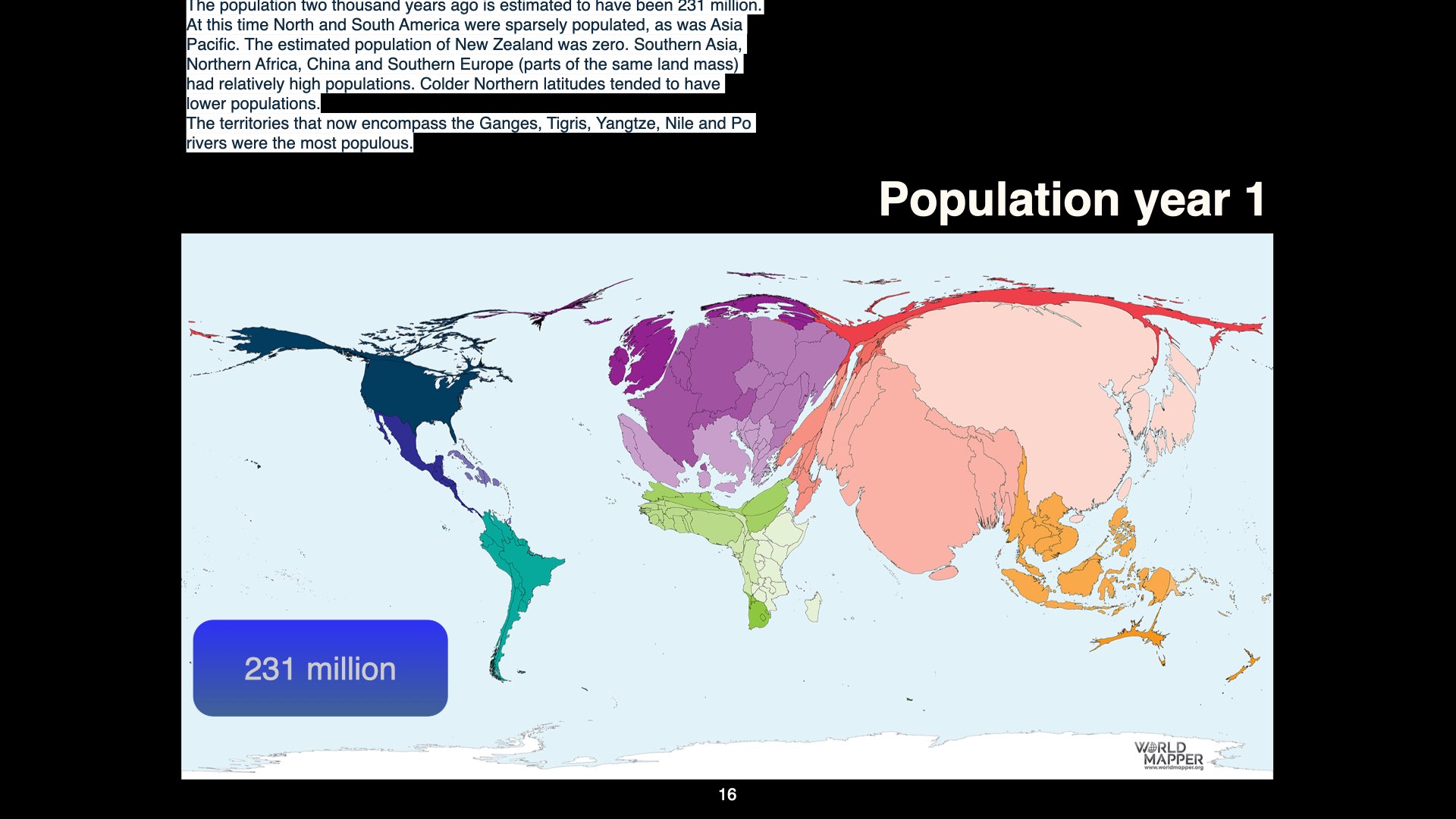 If we look back 2,000 years ago, in year one (according to our calendar), most people were in Southeast Asia and Europe. Some distortion in South America is due to Inca and Maya populations, but mostly, the bulk of the population was in Asia and Northern Europe. Very few people were in North America, and New Zealand was unpopulated.