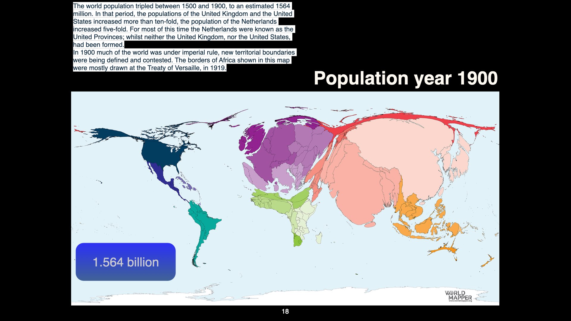 Moving forward 1,500 years, we see Asia and Northern Europe remain large, with Asia expanding. North America now grows in size, which shows that the population began to rise there. Later, during the last 500 years or so, Africa saw rapid population expansion.