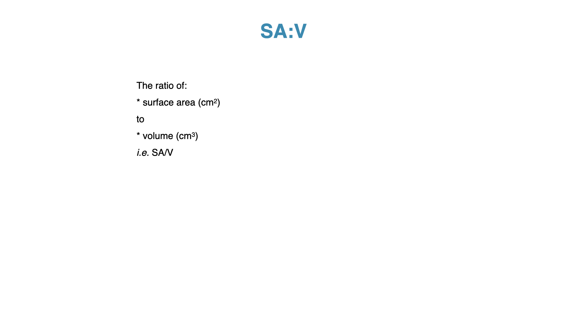So, when we talk about the surface area to volume ratio, we talk about the flat external surface—the skin, the total area of skin around a human body, or the two sides of a leaf, which is typically measured in square centimetres. The ratio of that quantity to the volume of something, which is the internal bulk of an organism—everything below your skin, or your meat, bones, and organs, or within, say, the leaf, where there might be one, two, or three layers of cells – this is the volume, measured in cubic centimeters 9or similar). So the ratio of these things—the surface area measured in square centimetres to the volume in cubic centimetres—is what’s commonly called the surface area to volume ratio.