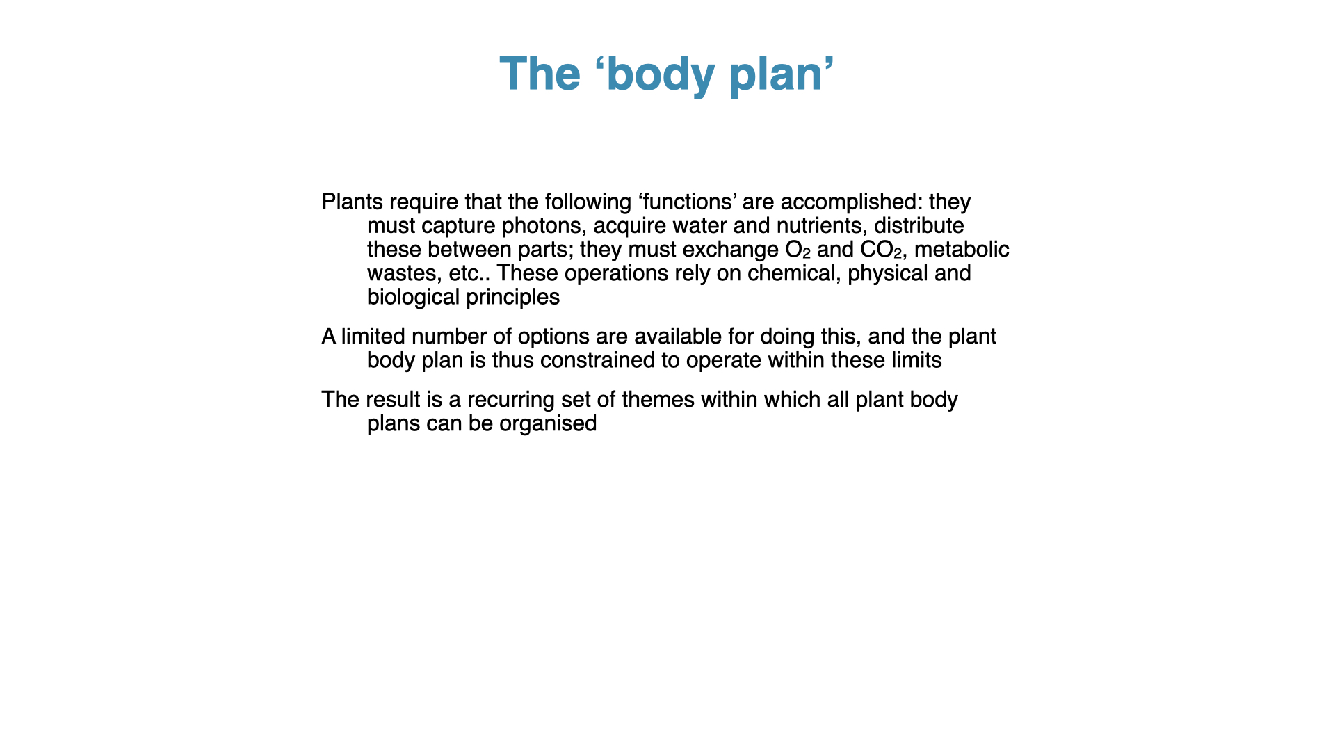 All of these operations require—or are based upon—various chemical, physical, and biological principles that impose various constraints on the rate at which these processes can operate. All of these functions are also constrained by the various parts of a plant body, the thallus. It helps us to also understand the construction—“construction” in inverted commas, because it hasn’t been constructed by a person, it just evolved. So we need to understand the various components that form the structure of a full plant body that permit these various different operations: CO₂ uptake, waste disposal, water uptake, and all of these.