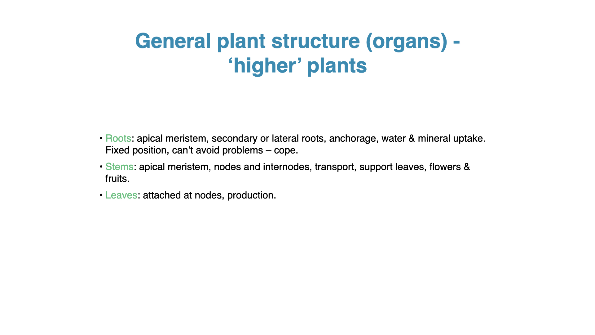 When we talk about higher plants, these would typically be the things that we see outside the window. If you walk around in nature, these would be angiosperms and gymnosperms. All of them are comprised of roots, stems, and leaves.