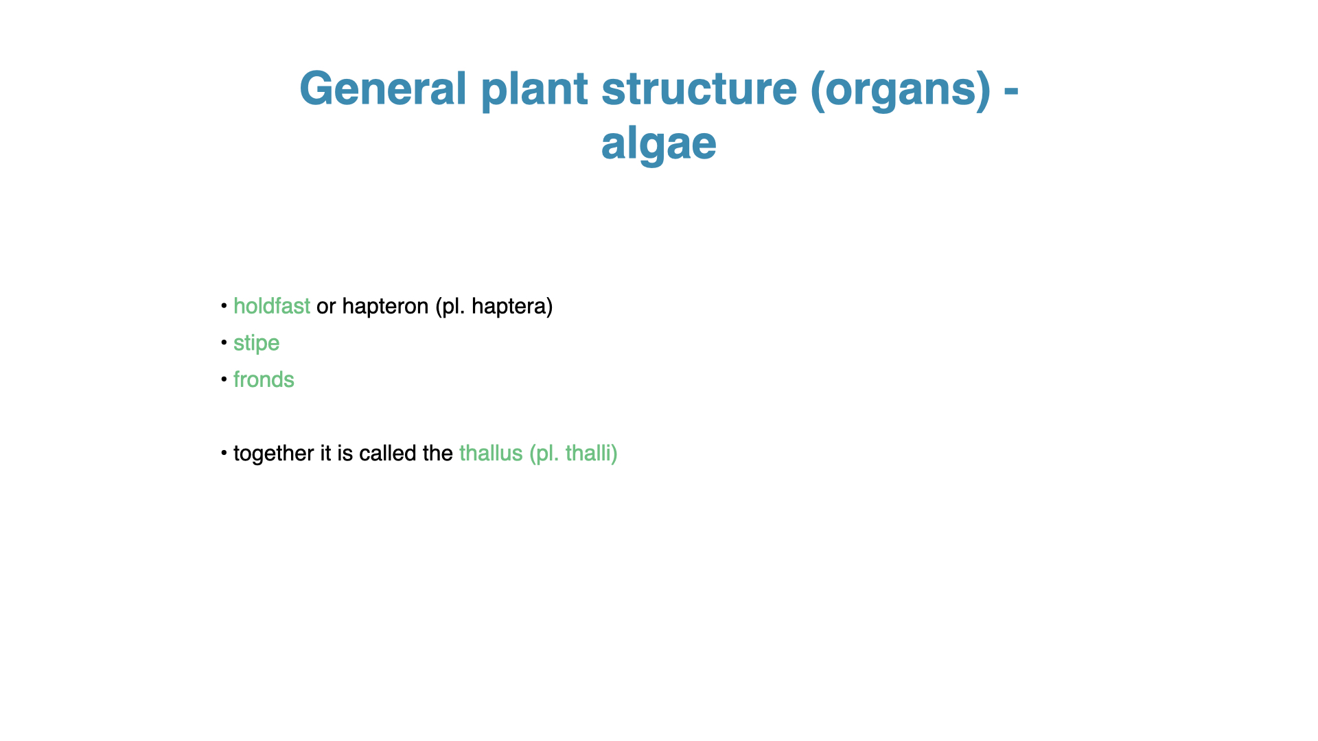 Plant structure concepts can also be translated to seaweeds—algae that live in the ocean or in fresh water. They have similar structures, though called something else. In seaweeds, you typically have not roots but a holdfast which is just like a hand—sometimes called a hapteron (plural haptera)—looks like a hand that grabs onto something for anchorage. The only purpose of a hapteron is to anchor a seaweed onto the ground, and larger seaweeds have larger haptera in order to grab onto more surface area and more rock, so that they can anchor better, especially in wavy environments.