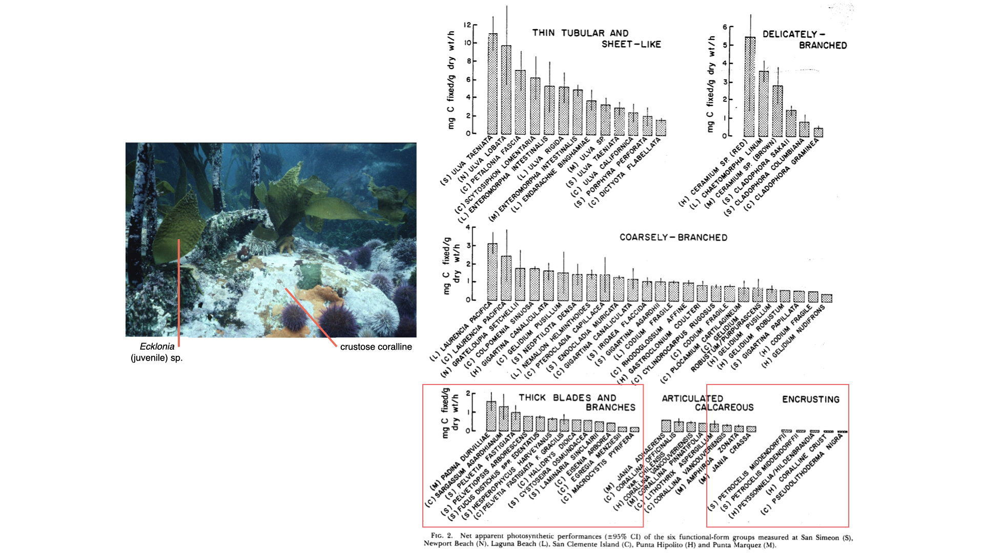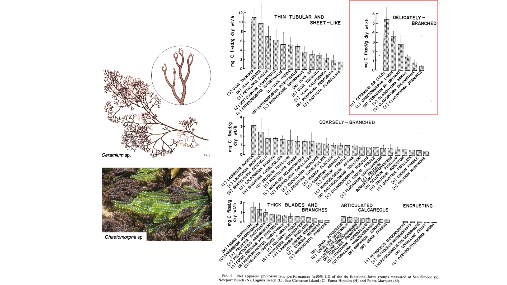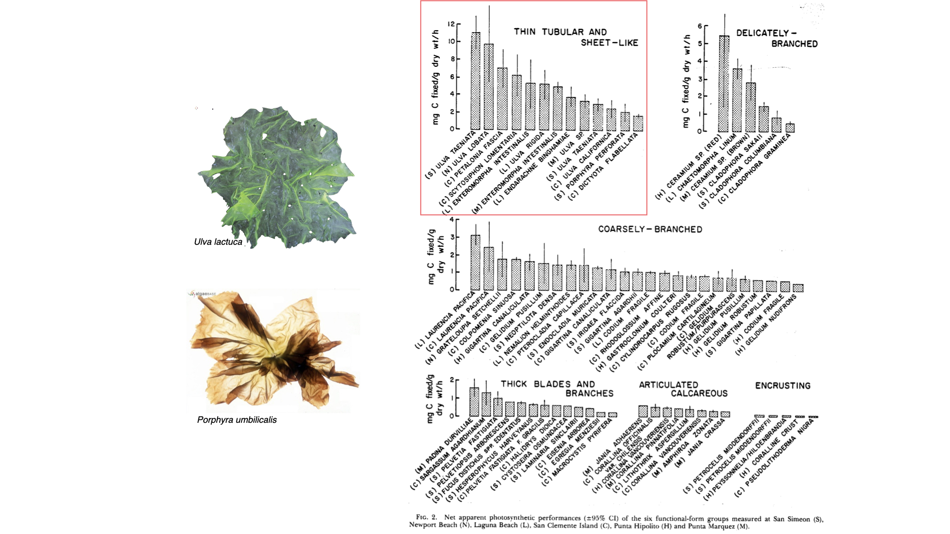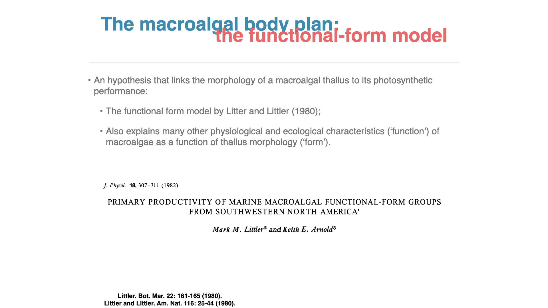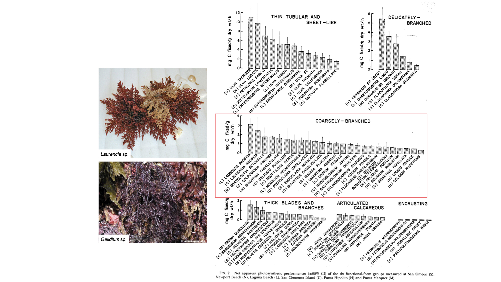 This is the important paper that you need to read. It was published originally in the late 1970s by Mark and Diane Littler, but the one I want you to read for this lecture is on eConver—go and download it. It’s called “Primary Productivity of Marine Macroalgae or Marine Macroalgal Functional Form Groups from Southwestern North America.” What Mark and Diane Littler did, and Keith Arnold in later collaborations, was to look at functional forms of seaweeds, dividing them into different groups, each characterised by different surface area to volume ratios. The experiments clearly show that as surface area and volume ratio changes, various ecophysiological functions of the algae change.