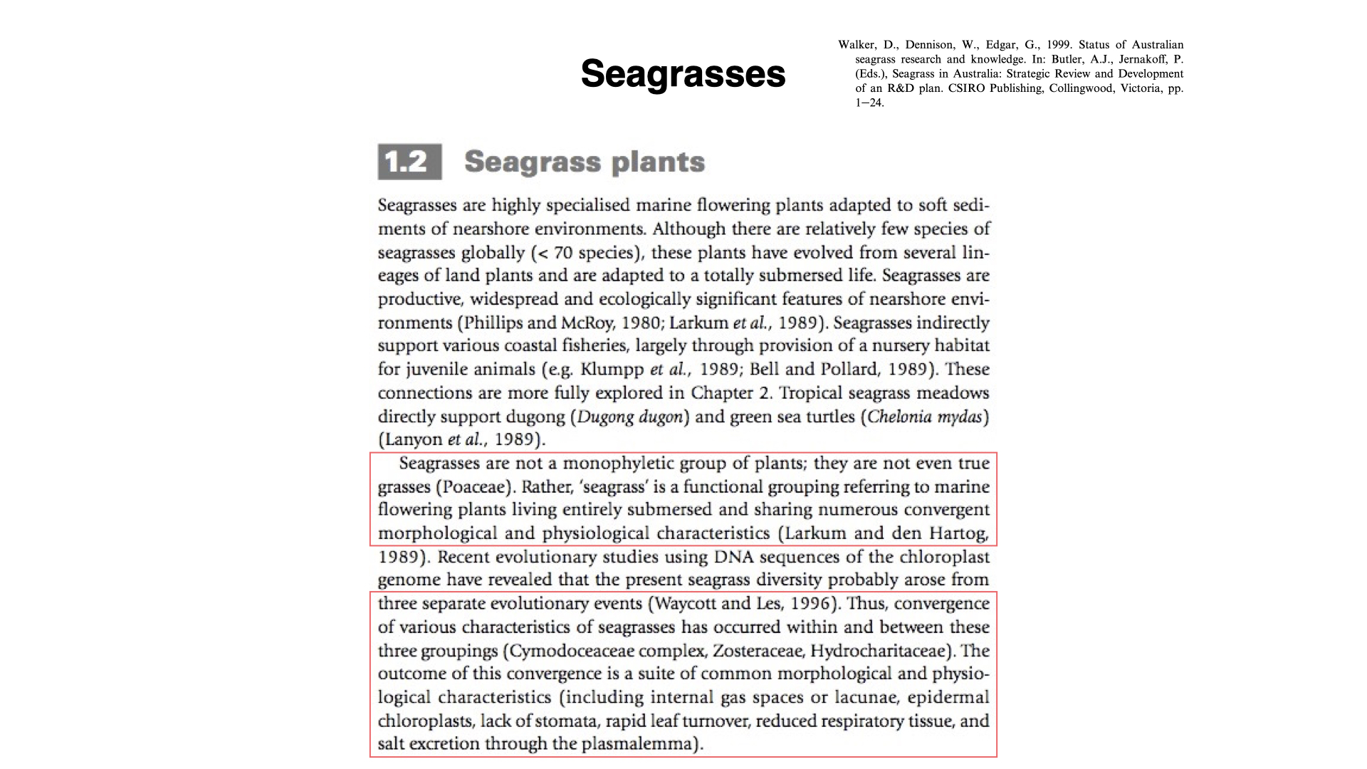 Now, let’s extend this analysis to seagrasses. Seagrasses are, of course, angiosperms. They are different from true grasses but have evolved from land plants to reoccupy marine spaces. If you dive in seagrass meadows, for instance in Australia where these are abundant, it looks like a lawn of grass underwater. These meadows are often dominated by one or a few seagrass species.