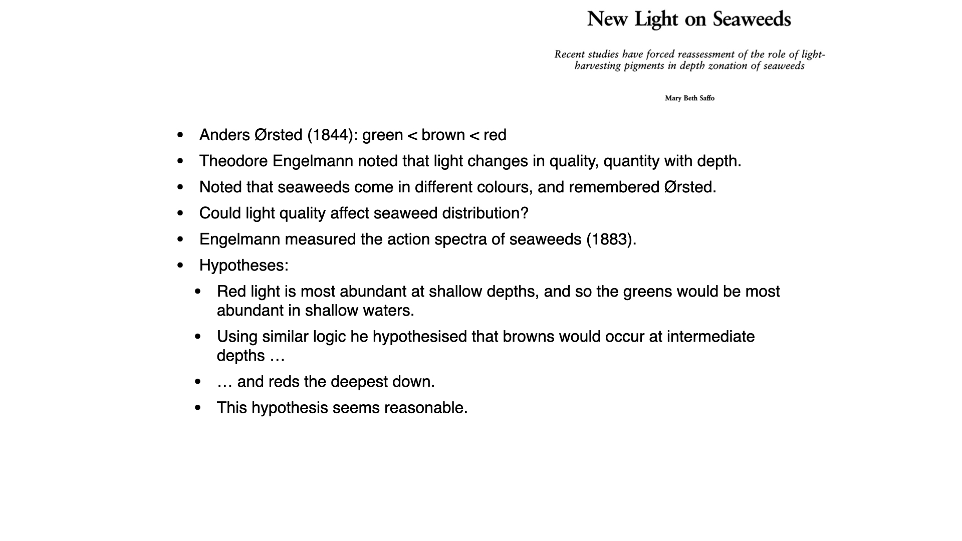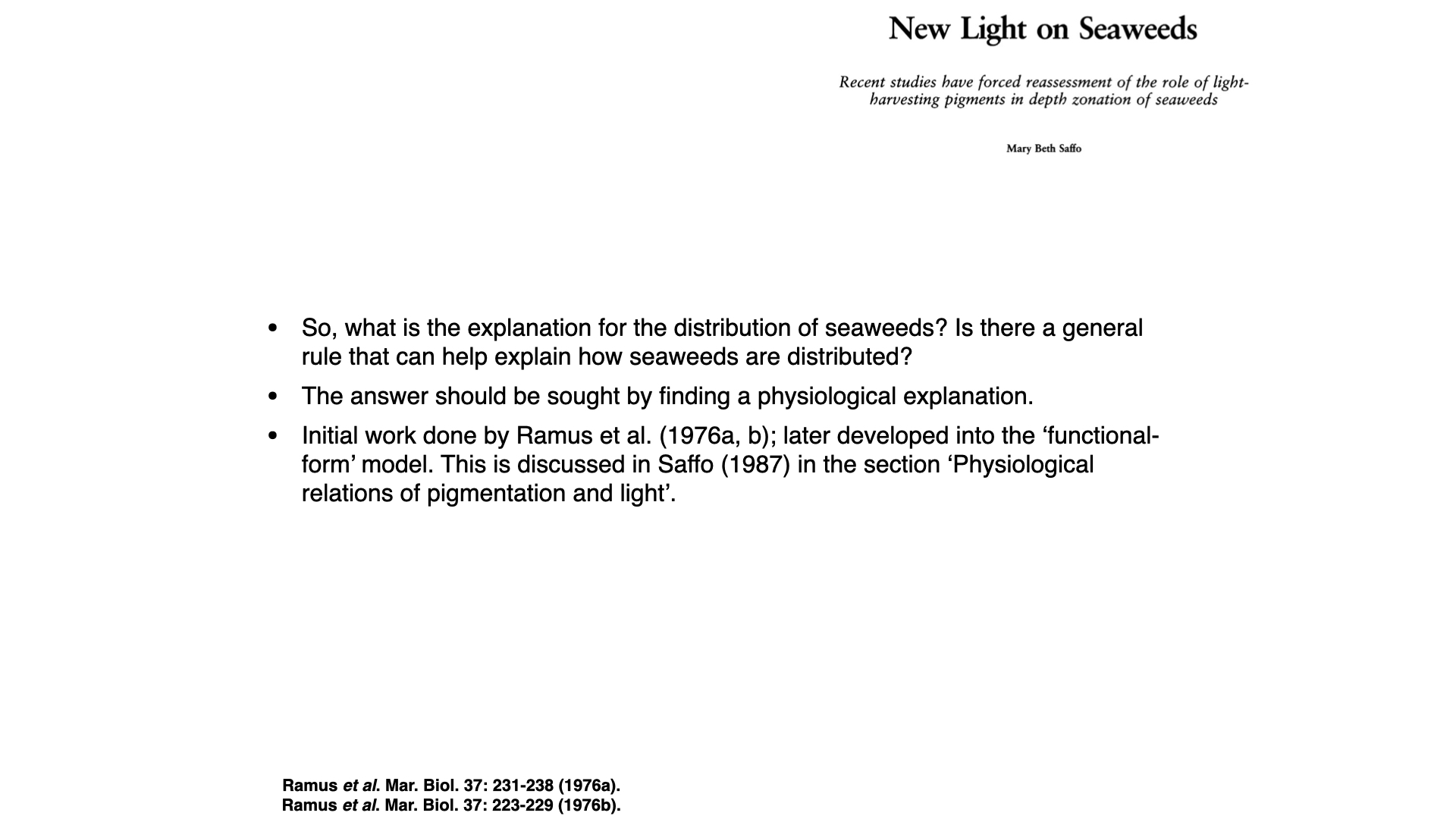Right, so now we’re going to look at the third part of our series of lectures on chromatic adaptation and, this time, we’re going to examine some in situ experiments that explore how seaweeds adapt—or more accurately, acclimatise—to different light regimes within the ocean. This is a very different approach compared to the earlier studies by Engelmann, Haxo, and Blinks, all of whom relied on laboratory studies, isolating seaweeds from the ambient environment and failing to explore how they respond adaptively or acclimatise to changing environmental conditions. This is where Rosenberg and Ramus’s work is quite distinct.