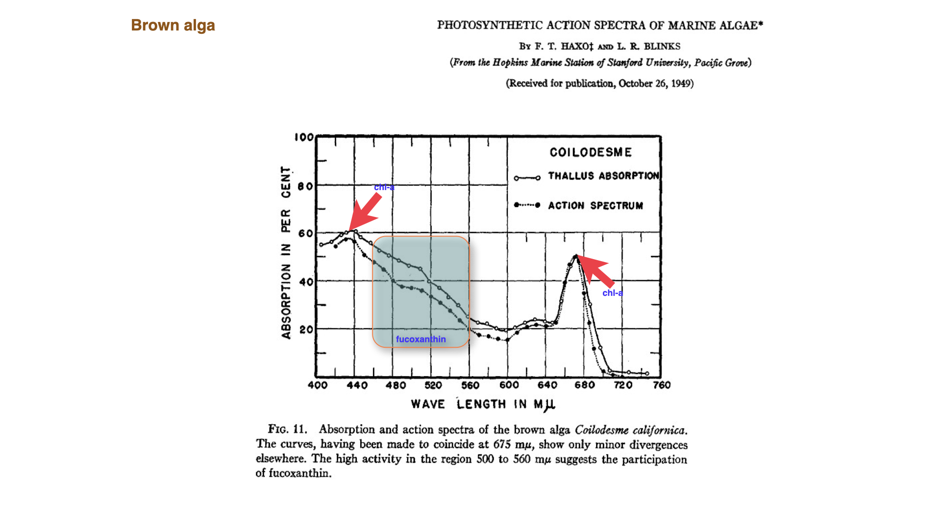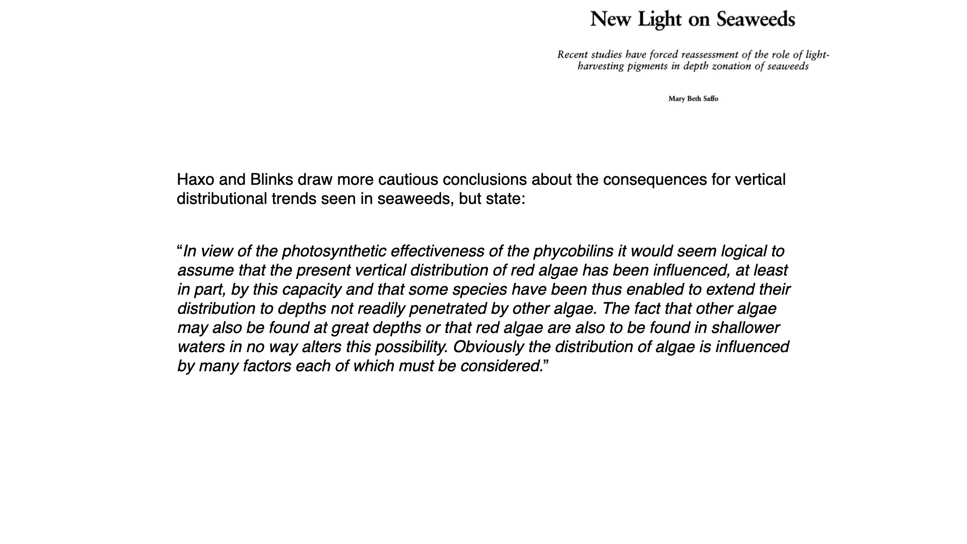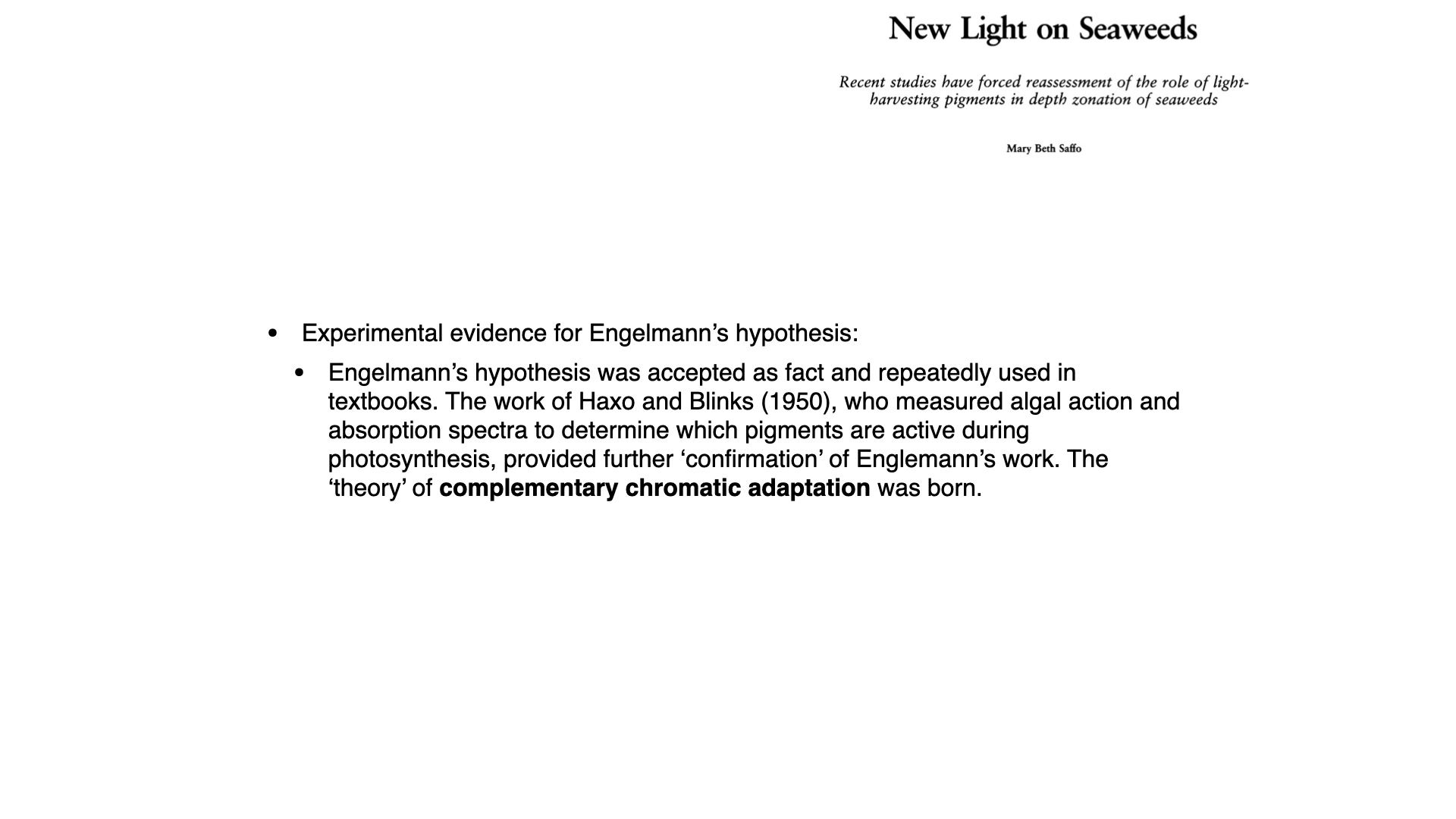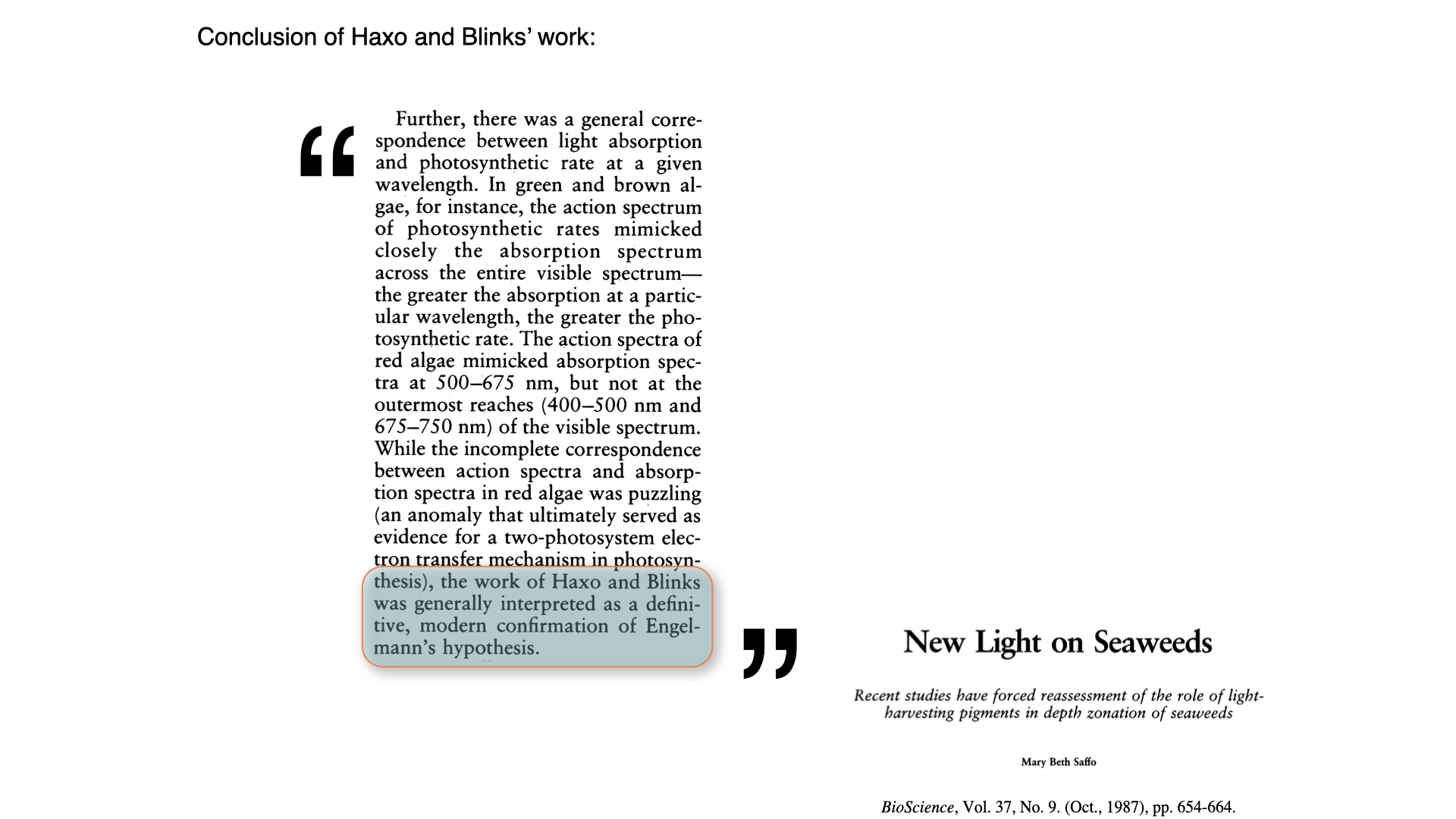 Fundamentally, the work of Haxo and Blinks provides modern and more definitive confirmation of Engelmann’s earlier findings, as noted in subsequent review papers by authors such as Mary Beth Saffo . However, the conclusions drawn by Haxo and Blinks are somewhat more measured regarding the vertical distribution of seaweeds.