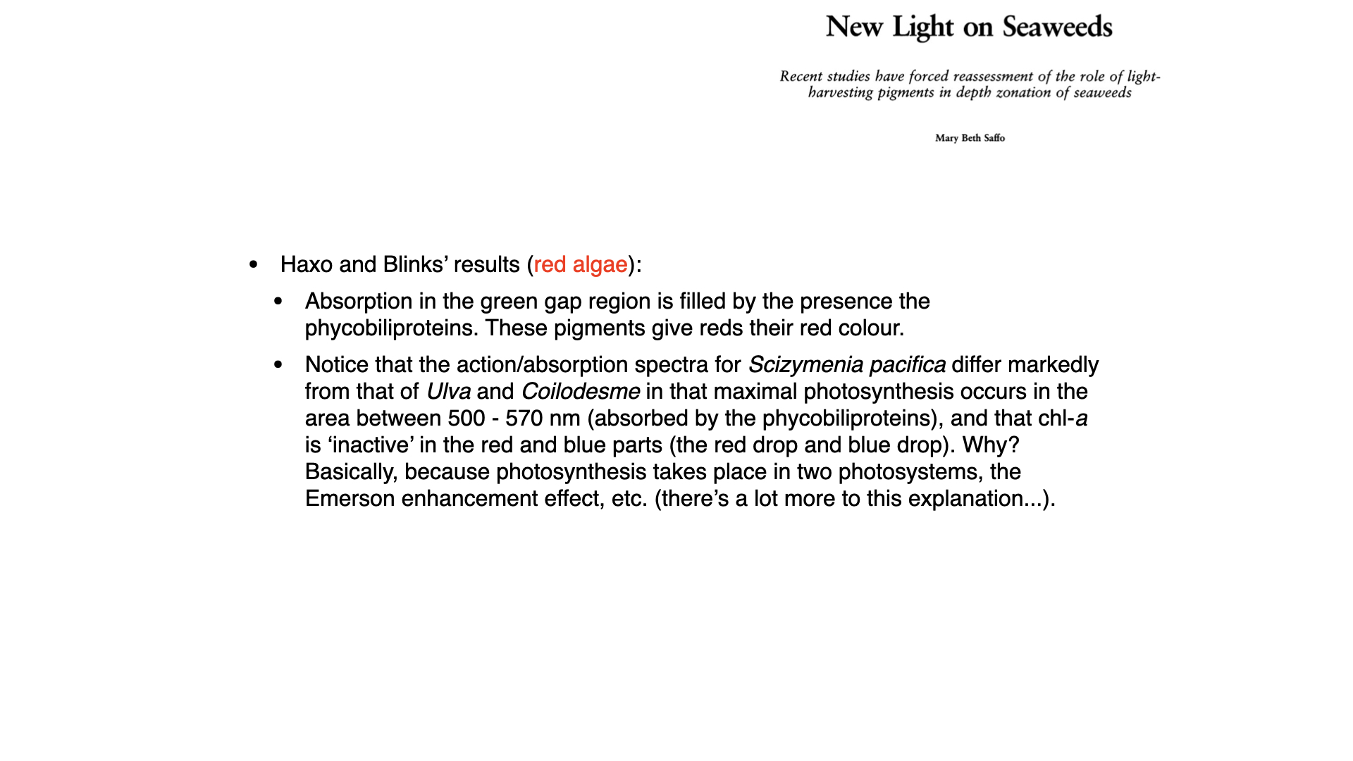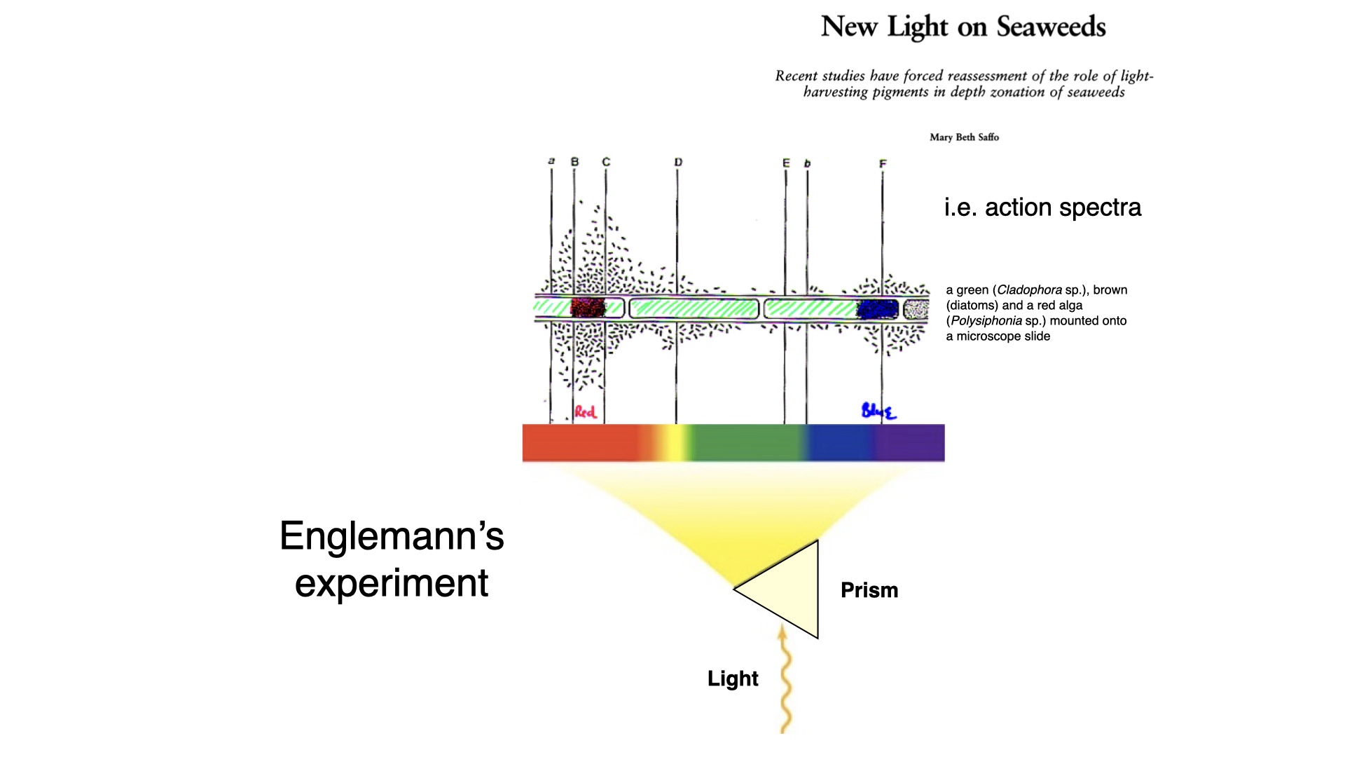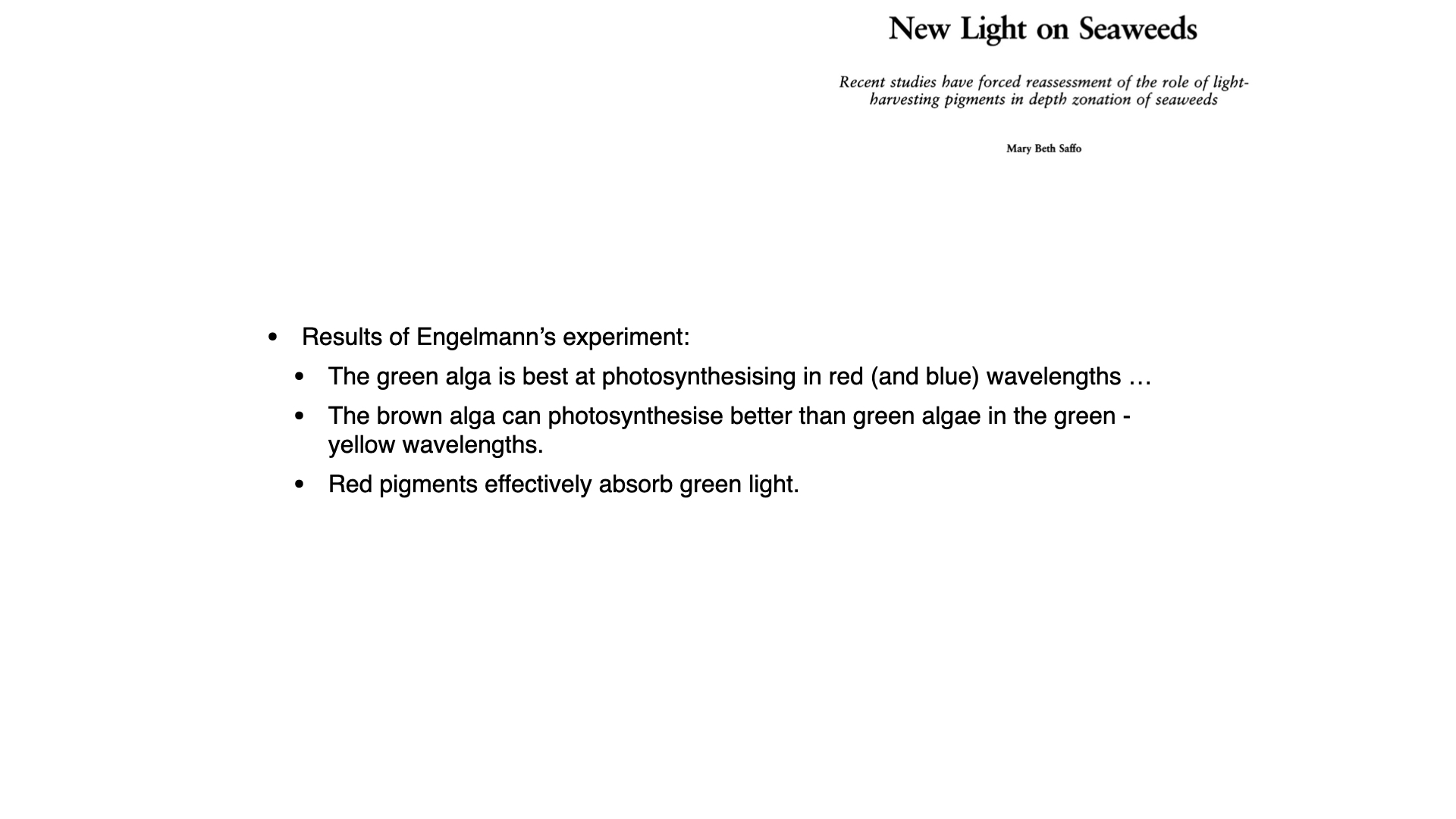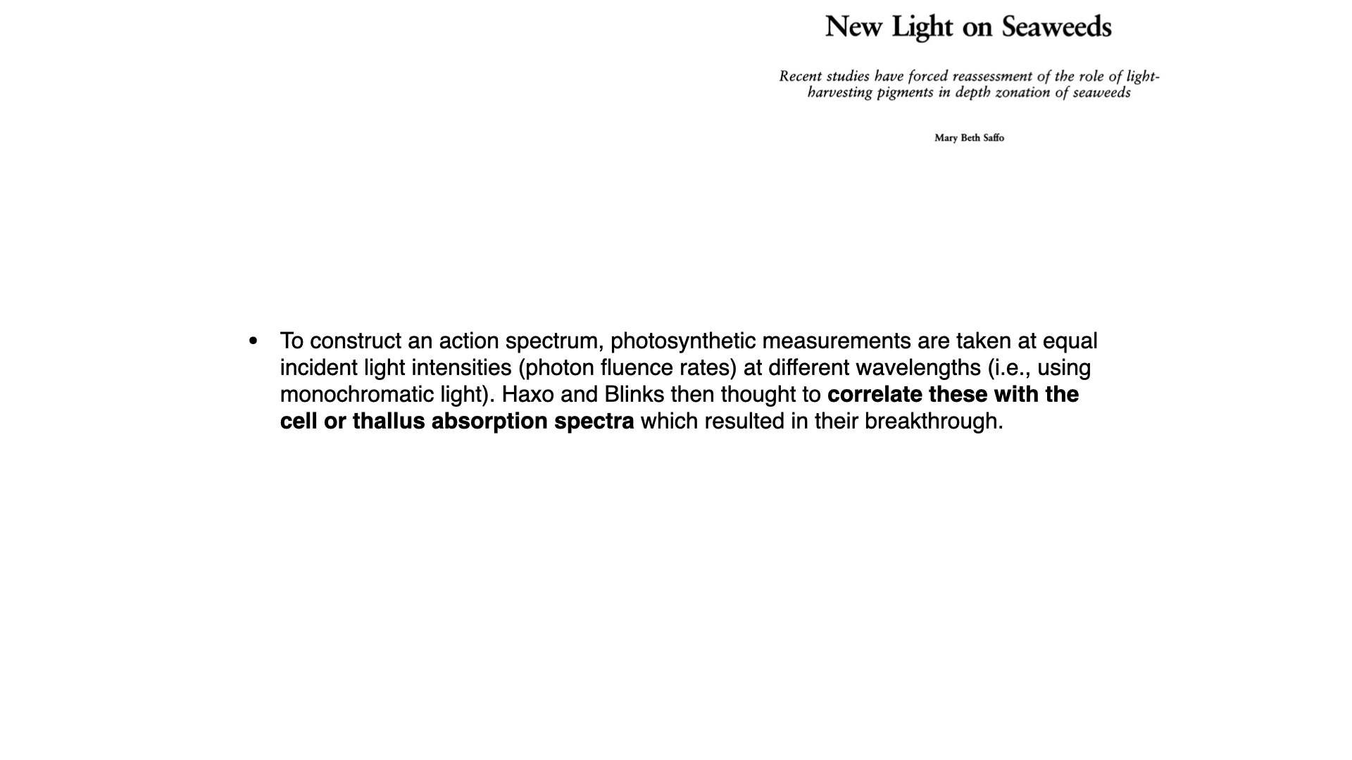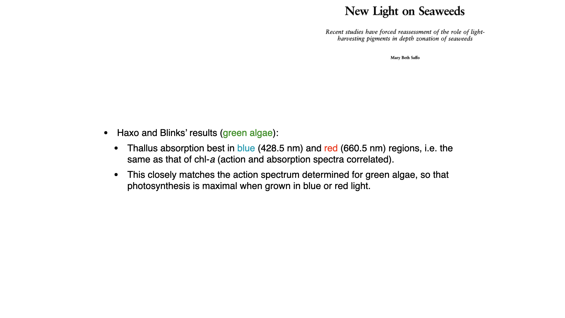 Fundamentally, the work of Haxo and Blinks provides modern and more definitive confirmation of Engelmann’s earlier findings, as noted in subsequent review papers by authors such as Mary Beth Saffo . However, the conclusions drawn by Haxo and Blinks are somewhat more measured regarding the vertical distribution of seaweeds.