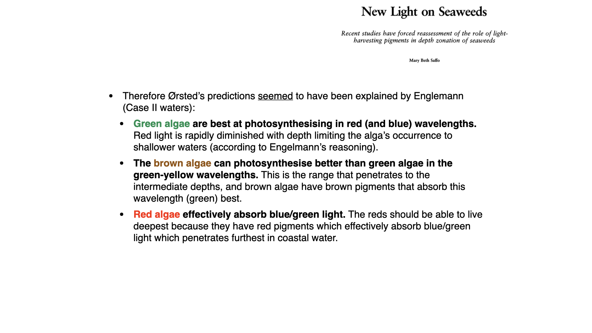 He reasoned that brown algae, with their ability to exploit greenish wavelengths due to xanthophylls, would be most successful at intermediate depths. Meanwhile, red algae—able to use blue light particularly efficiently—would dominate the deeper ocean, where blue and green light are most available.