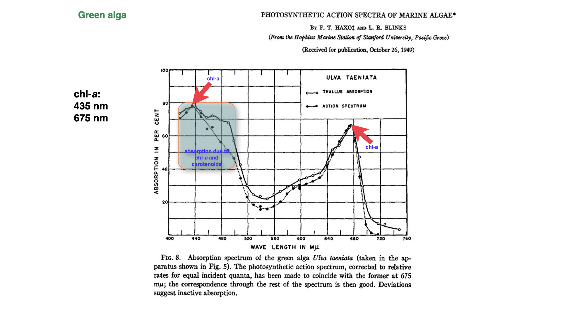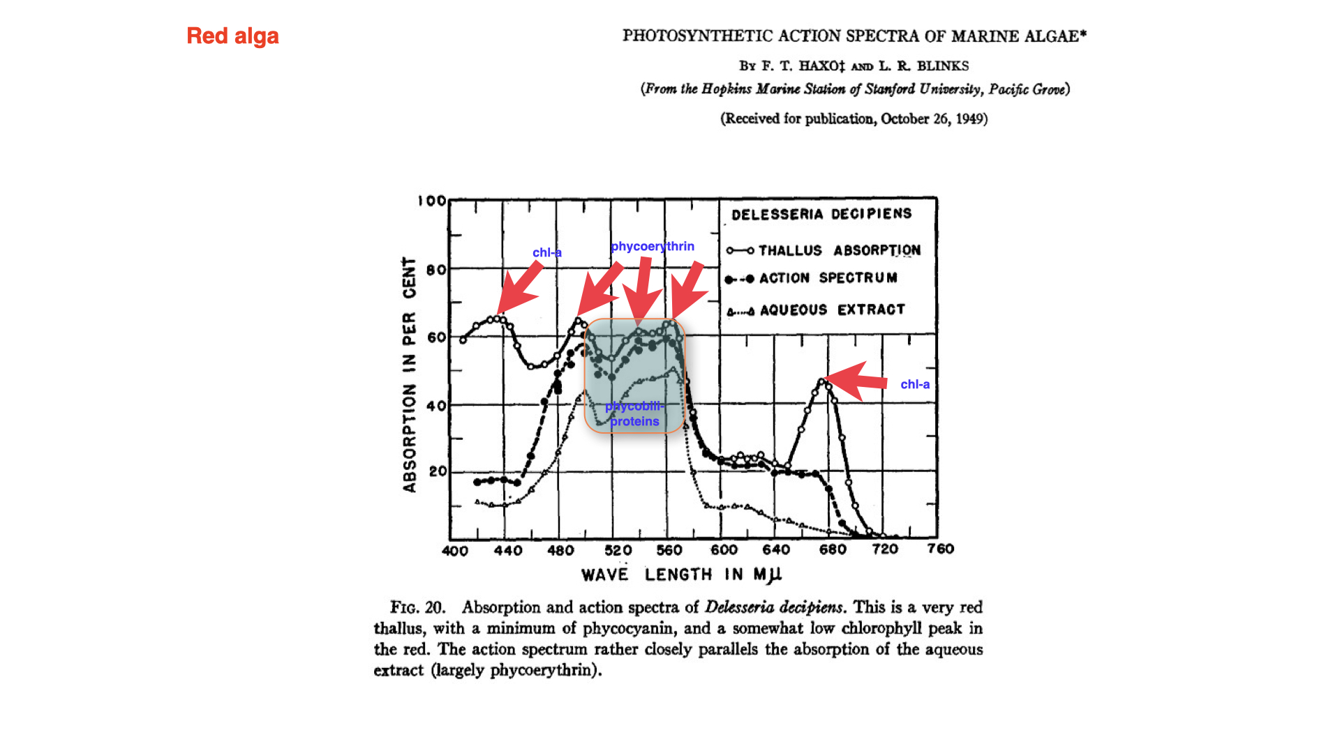 In their studies, Haxo and Blinks used a variety of red, brown, and green seaweeds—akin to Engelmann’s approach. However, they extended the methodology by examining not only the action spectra, but also the absorption spectra of both intact thalli and pigment extracts from the different seaweeds. As a result, they utilised three distinct lines of evidence in tandem: action spectra, absorption spectra from intact tissue, and spectra from pigment extracts. Engelmann had primarily focused on action spectra, whereas Haxo and Blinks introduced this more differentiated and integrated approach.