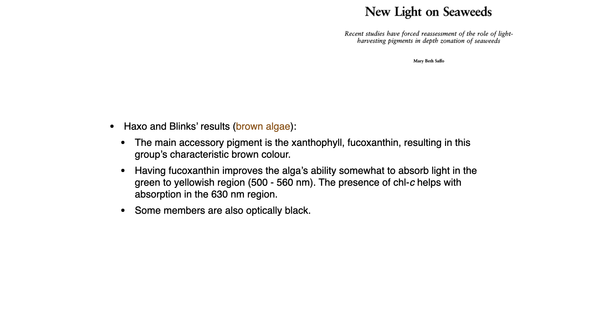 Similar experiments with brown algae showed that the dominant accessory pigments are xanthophylls, particularly fucoxanthin, which give these seaweeds their distinctive colour. Fucoxanthin enhances absorption in the green to yellowish part of the spectrum—between