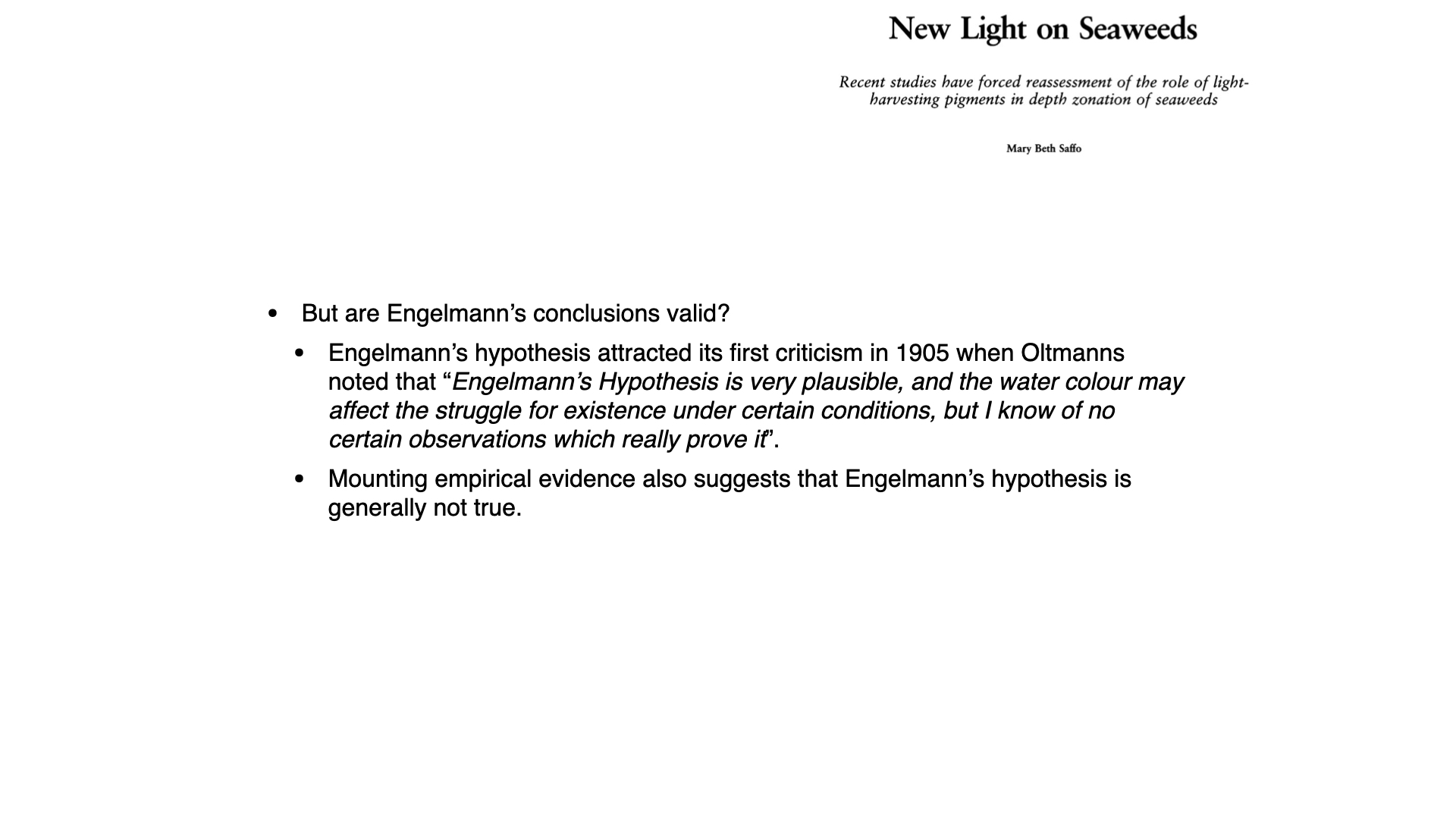 At the time, no one had directly surveyed seaweed distribution by colour at different depths, but the experimental and theoretical framework appeared solid. For decades, Engelmann’s work underpinned ecological thinking about seaweed vertical distribution—even as recently as the