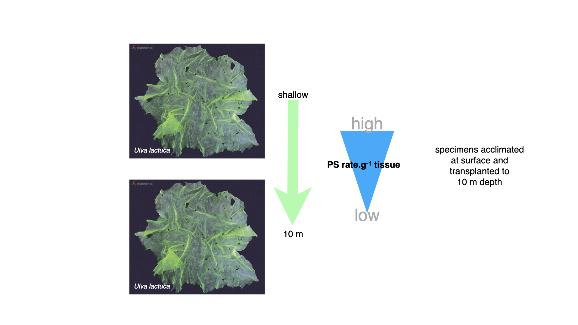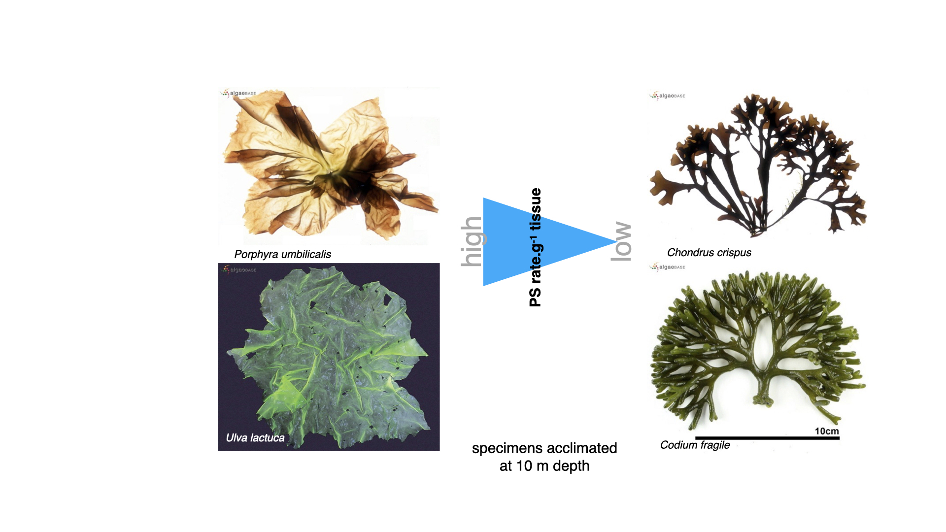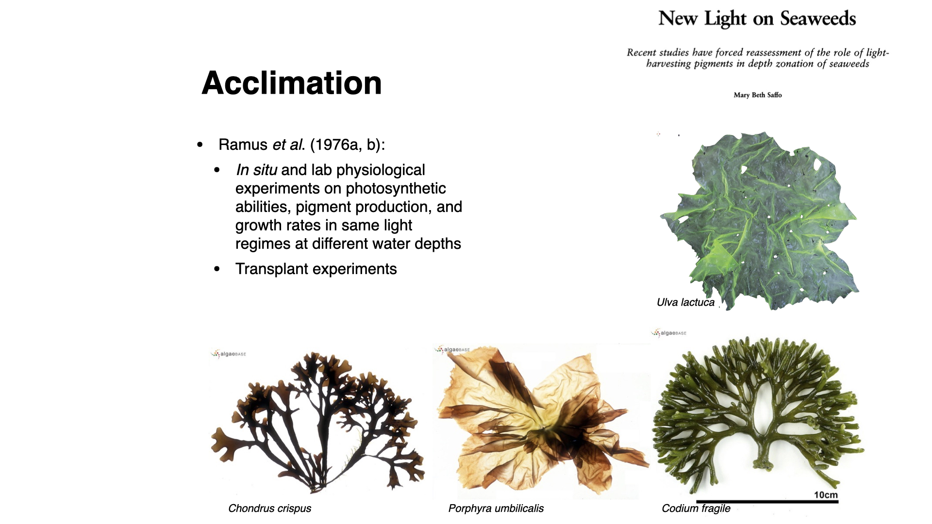 You’ll notice these represent two functional forms: the coarsely branched type (Chondrus and Codium) and the membranous group (Porphyra and Ulva). By spanning both different pigment groups and functional forms, Ramus and colleagues devised a transplant experiment to address how various algae types acclimatise to different oceanic light levels.