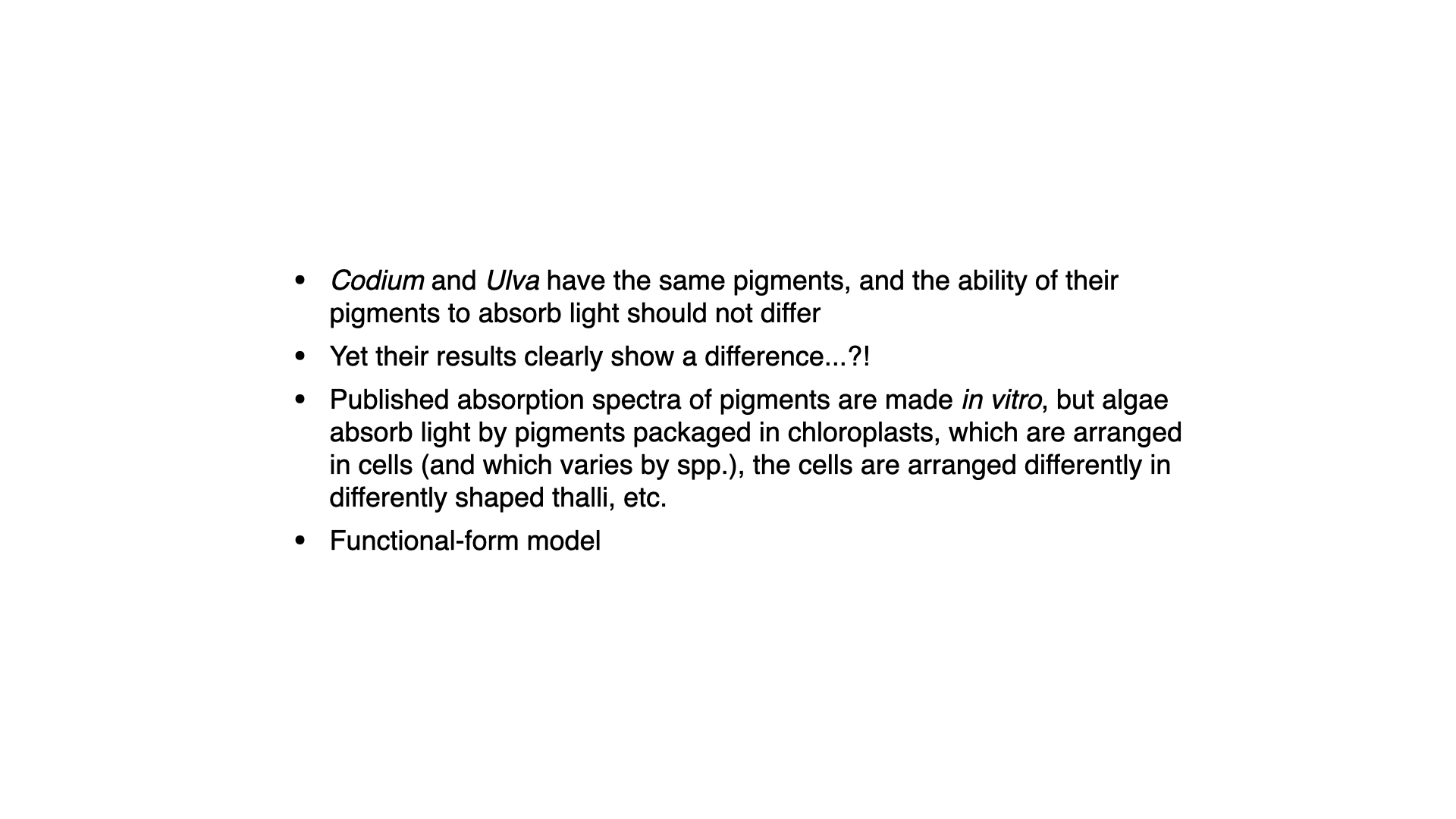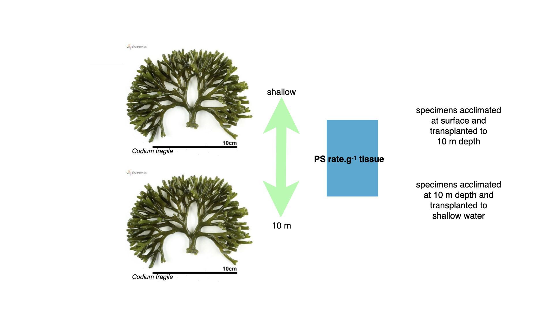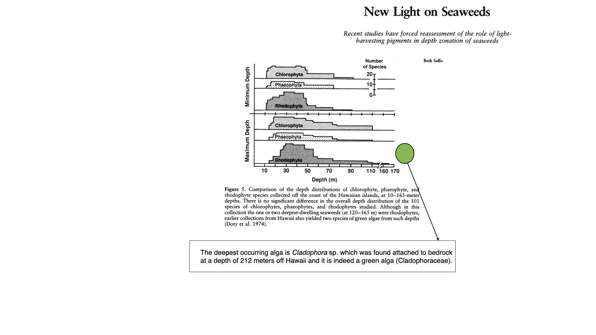 You’ll notice these represent two functional forms: the coarsely branched type (Chondrus and Codium) and the membranous group (Porphyra and Ulva). By spanning both different pigment groups and functional forms, Ramus and colleagues devised a transplant experiment to address how various algae types acclimatise to different oceanic light levels.