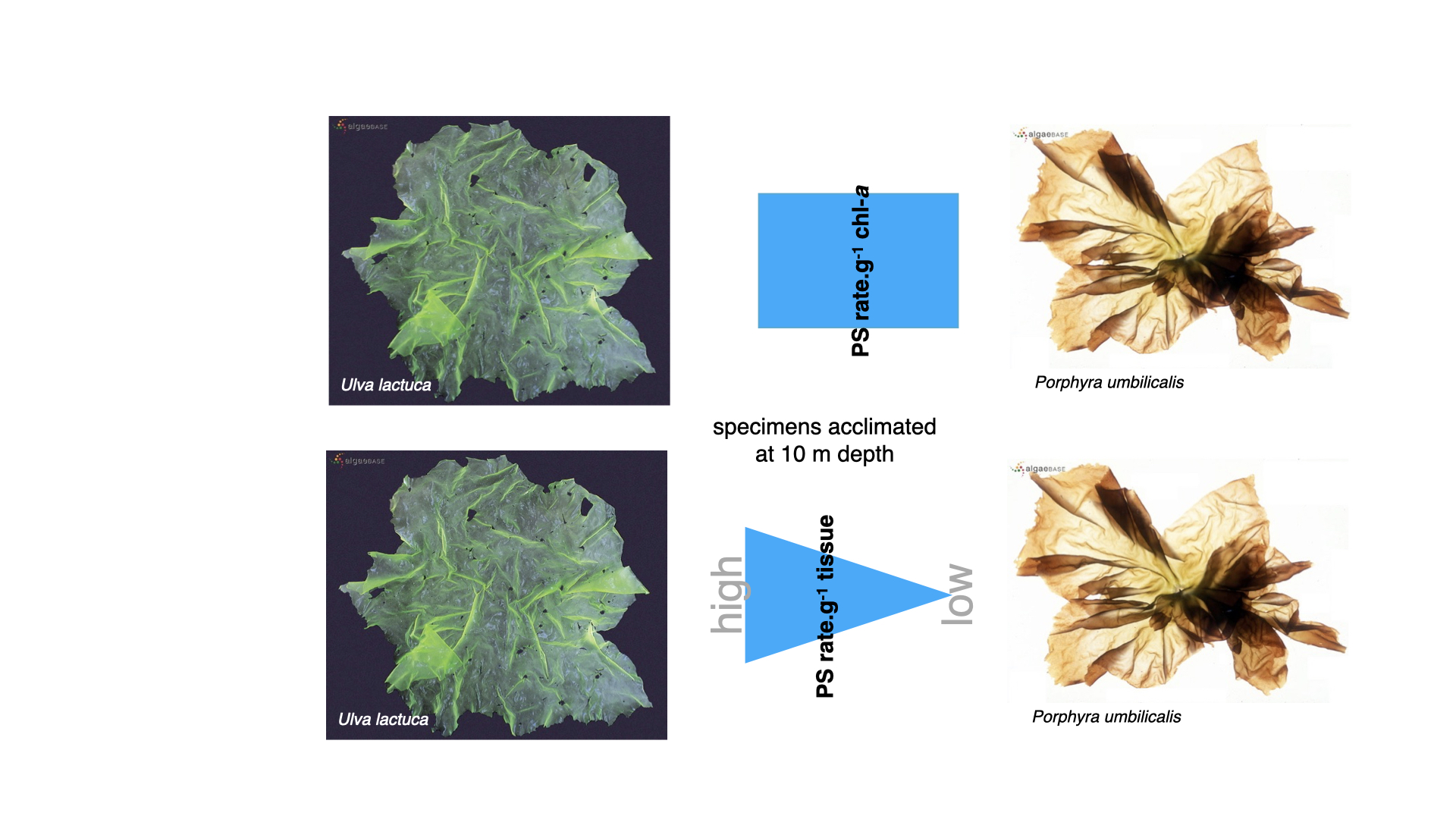 However, when expressing photosynthetic rate per gram of tissue (i.e., per gram of Ulva or Porphyra), Ulva outperforms Porphyra. The underlying reason is simple: one gram of Ulva contains more chlorophyll-a than one gram of Porphyra. This makes sense, since Ulva is mainly composed of chlorophyll-a, whereas in Porphyra, much of the pigment content consists of accessory pigments (principally phycobilins), rather than chlorophyll-a.