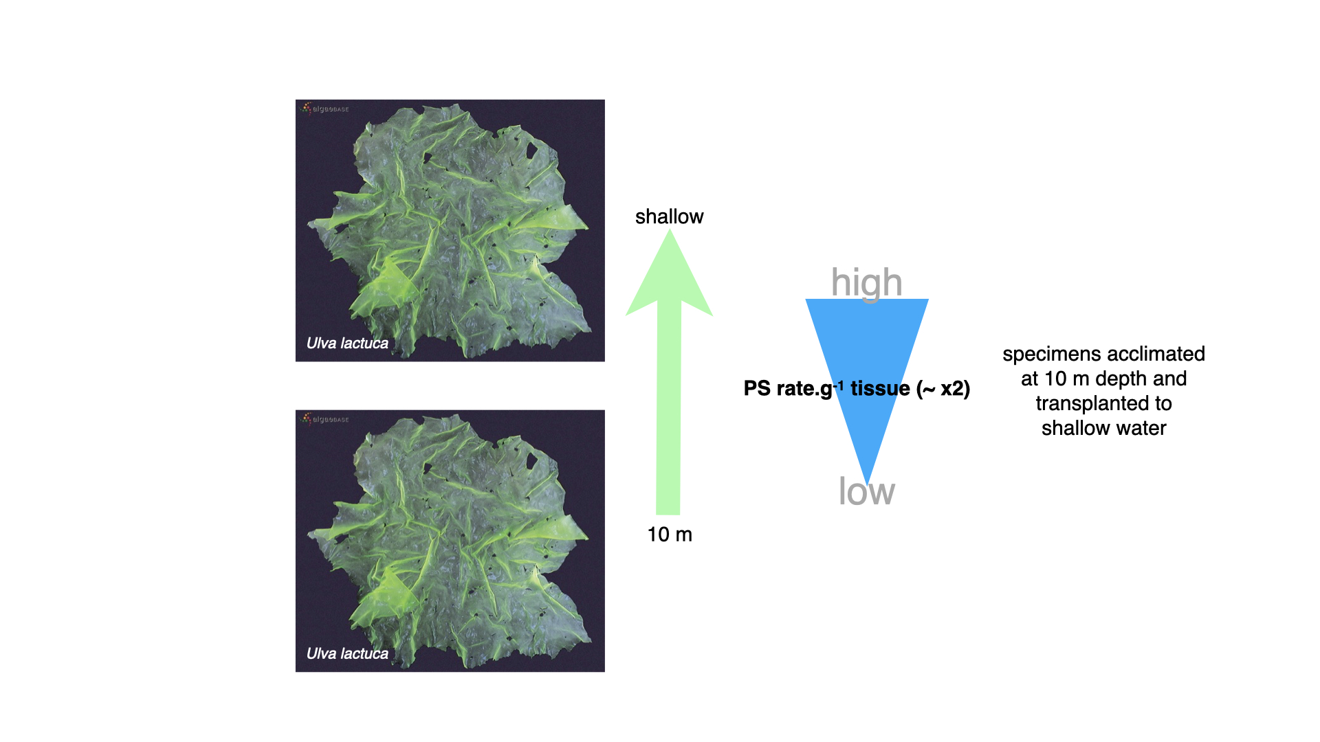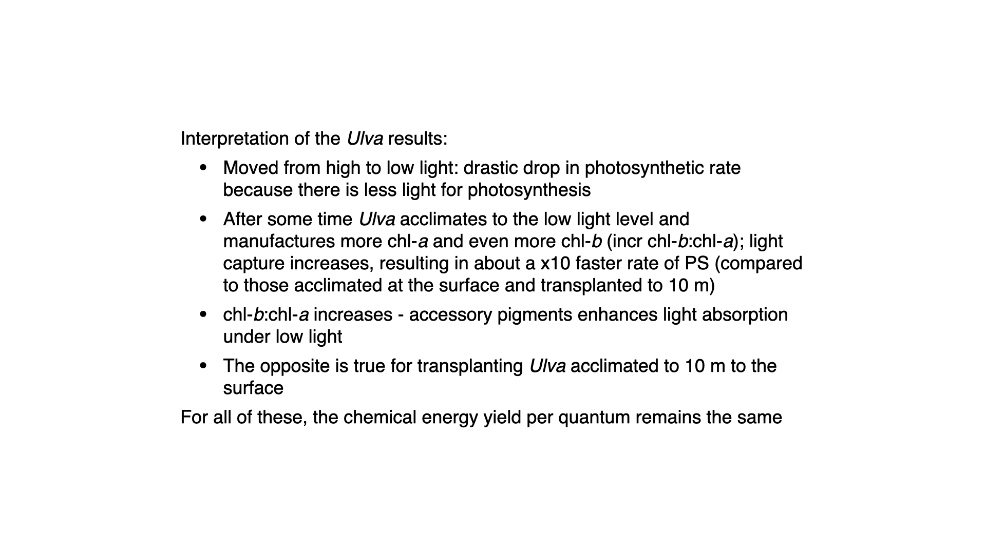 So, as Ulva is transplanted from high to low light (surface to depth), an immediate reduction in photosynthetic rate occurs—less light equals less photosynthesis. This represents the organism being placed at a lower segment of its PI (photosynthesis–irradiance) curve. However, left at depth for several weeks, Ulva gradually manufactures more chlorophyll-a and invests more energy into accessory pigment production (chlorophyll-b). The increased chlorophyll content raises light-harvesting capability, bringing the photosynthetic rate back up—sometimes reaching up to ten times greater than for non-acclimatised specimens moved directly from the surface to depth.