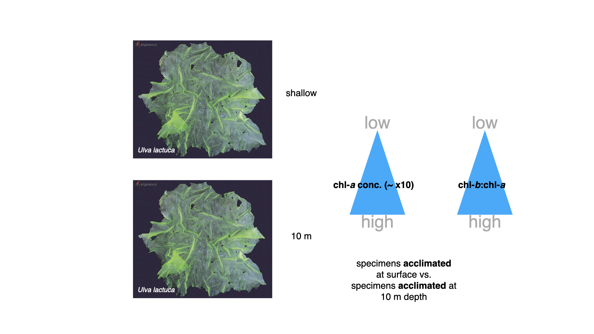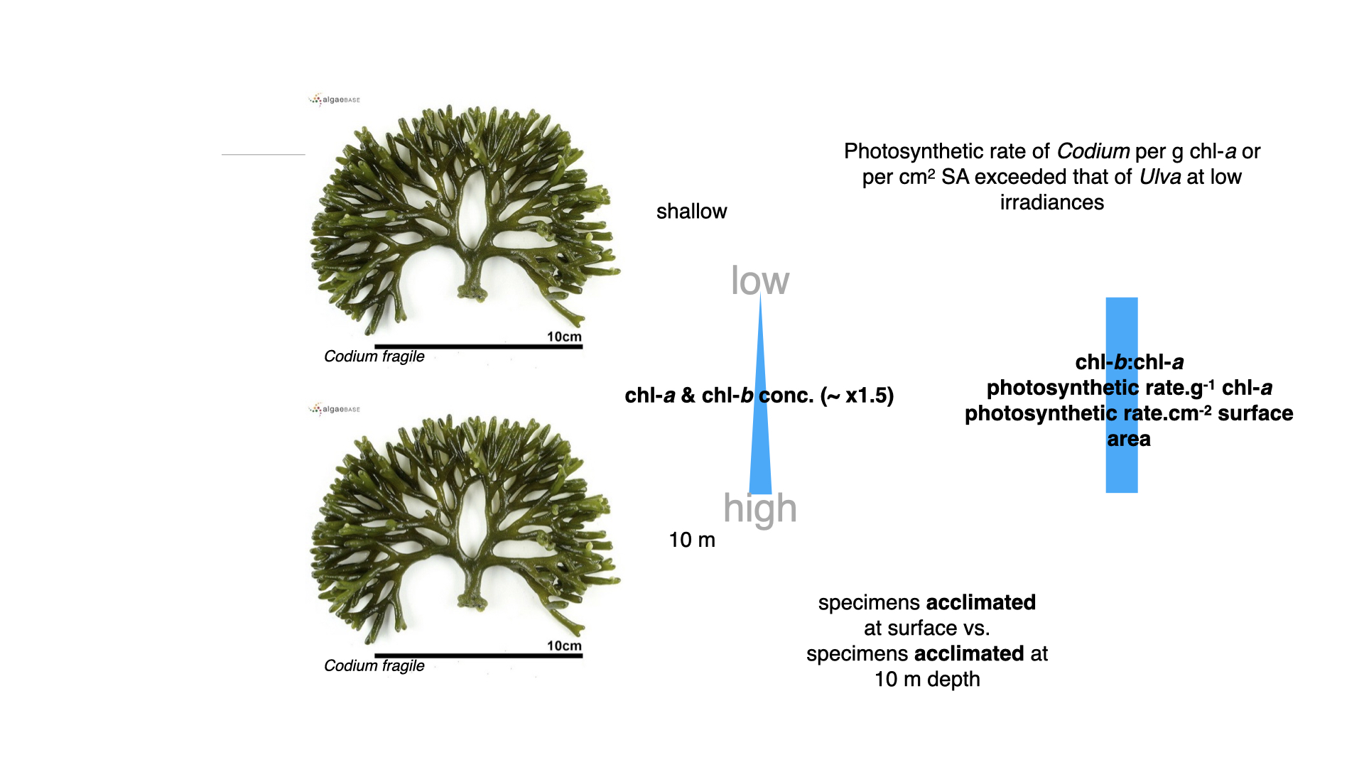 Looking into pigment concentrations for surface versus deep-acclimatised Codium, the difference was marginal—only about 1.5 times higher chlorophyll-a and b at depth. Moreover, neither the ratio of chlorophyll-b to chlorophyll-a, nor photosynthetic rates per chlorophyll-a or per surface area, differed much between environments.
