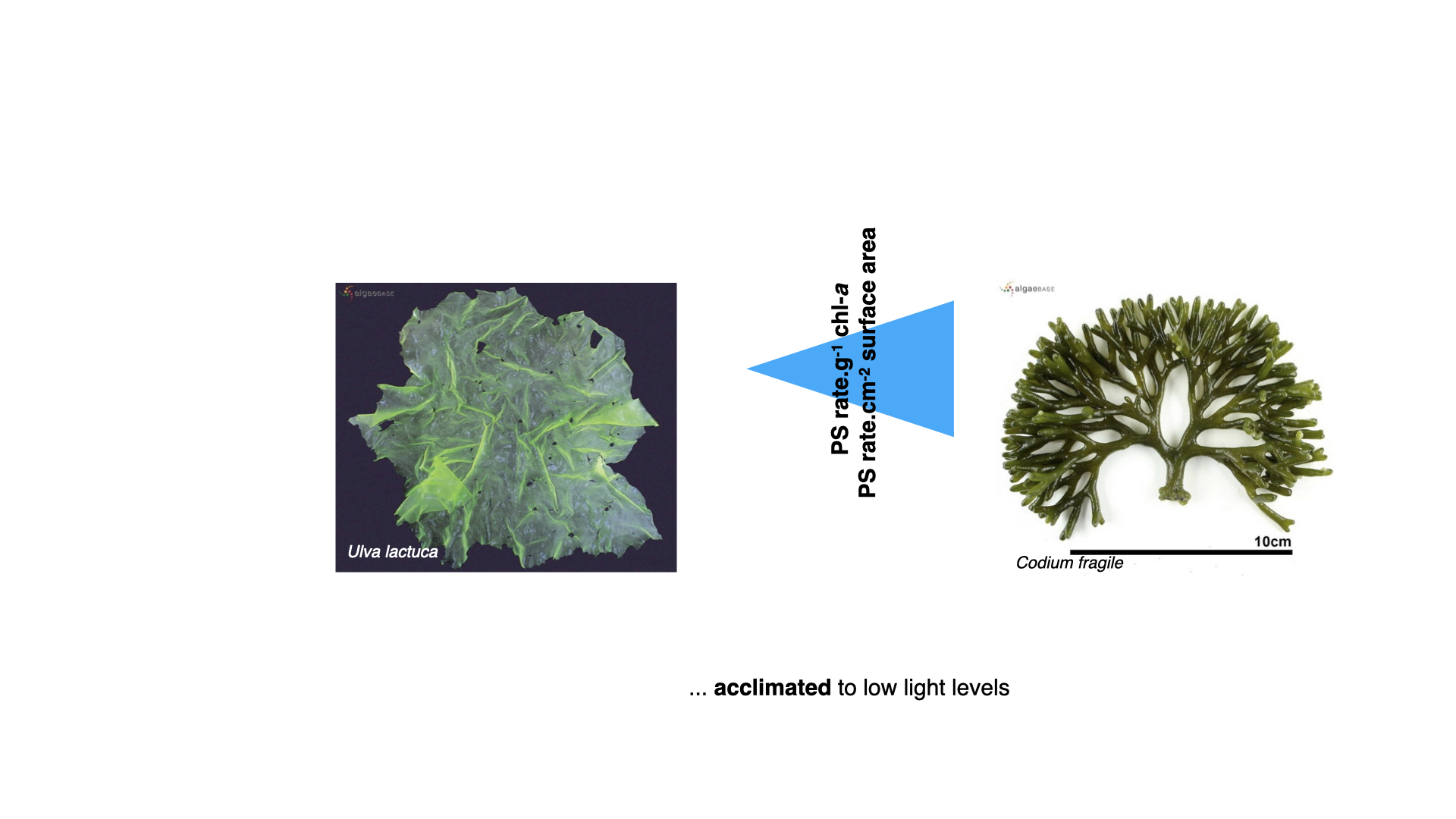 Once seaweeds were acclimatised to low light, they found that the photosynthetic rate per gram of chlorophyll-a in Codium—the coarsely branched green alga—was higher, and likewise, rate per unit surface area was greater compared with Ulva.