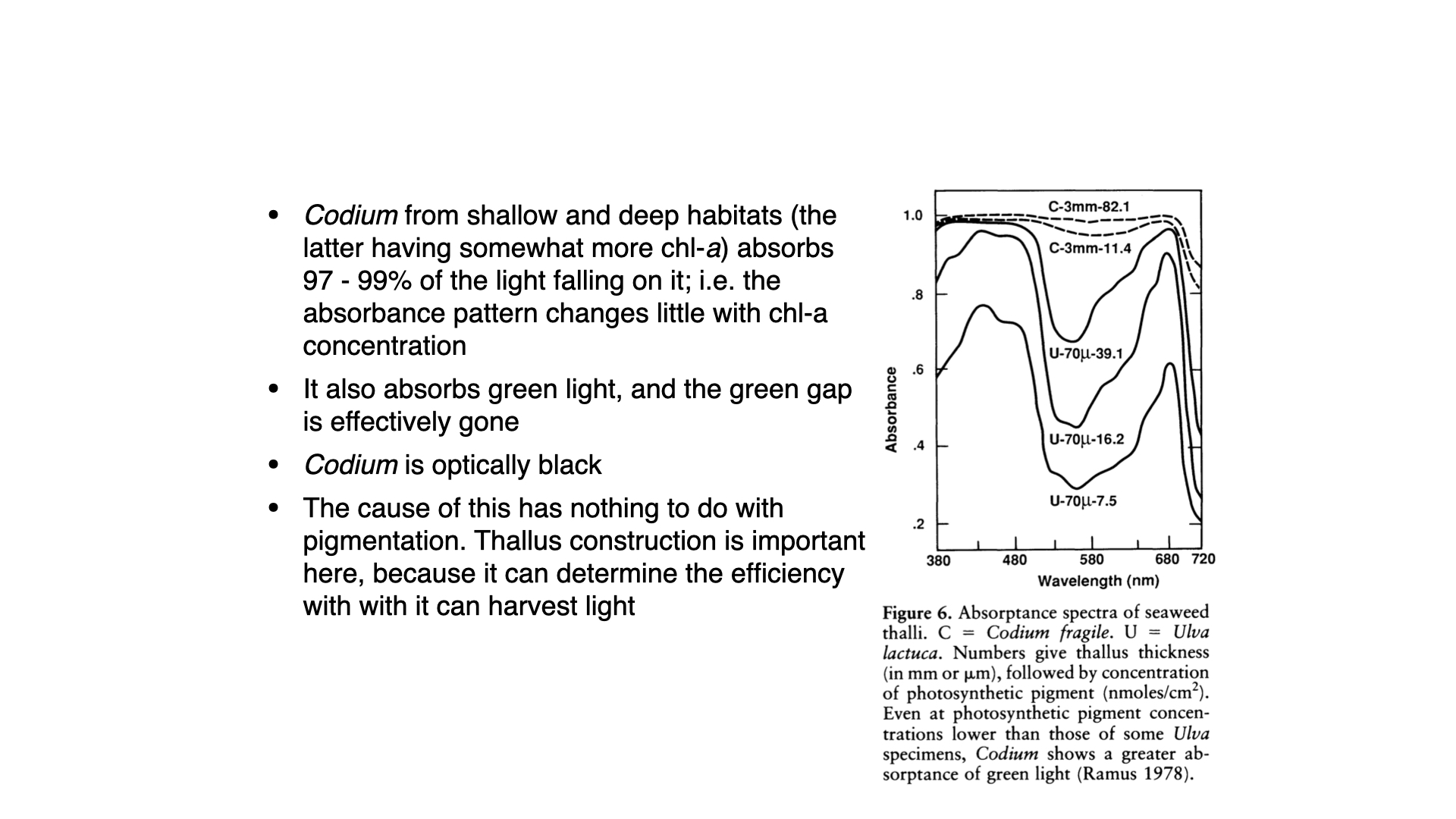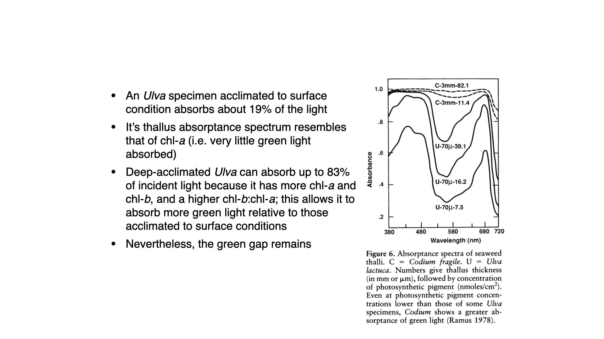 But even with increased pigment content, there’s always a green gap, as Ulva lacks the accessory pigments required to efficiently absorb green wavelengths. Interestingly, Codium also lacks such accessory pigments, yet it is able to absorb significant amounts of light even in the green gap.