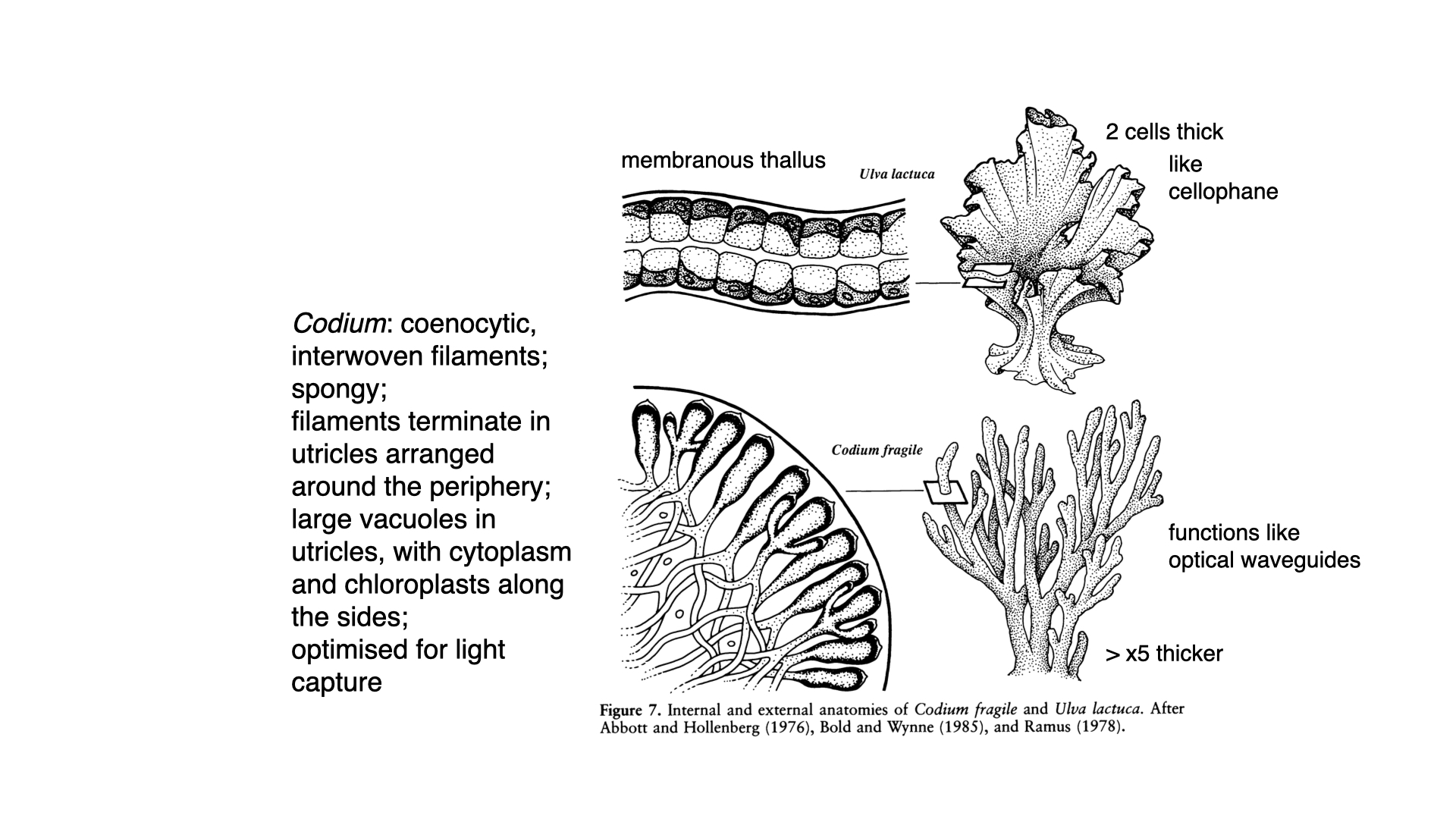 Ulva, by contrast, with its thin, “cellophane” membrane, allows much light to pass through, relying on every cell receiving direct illumination, but cannot match Codium’s absorptive efficiency in the green region or at depth.